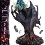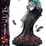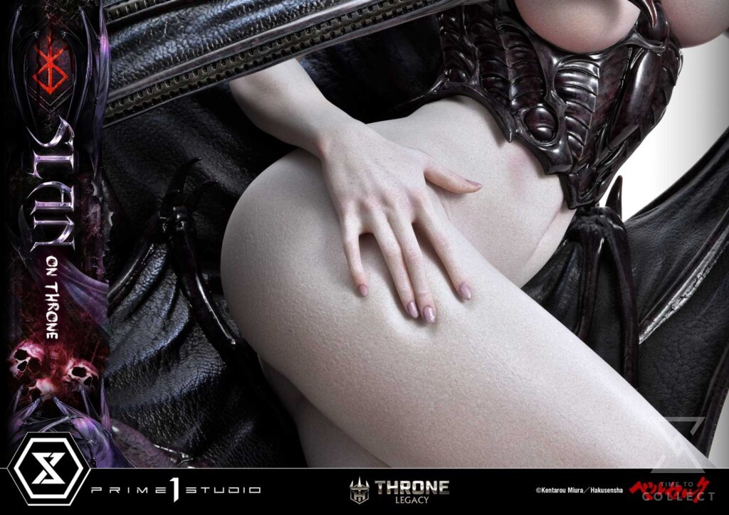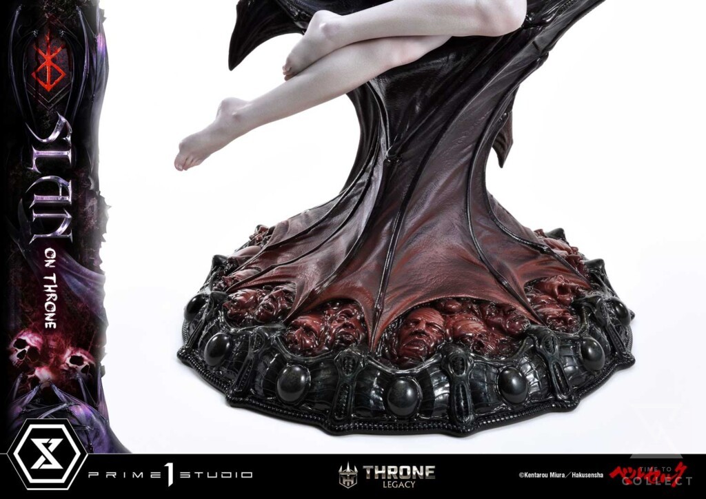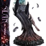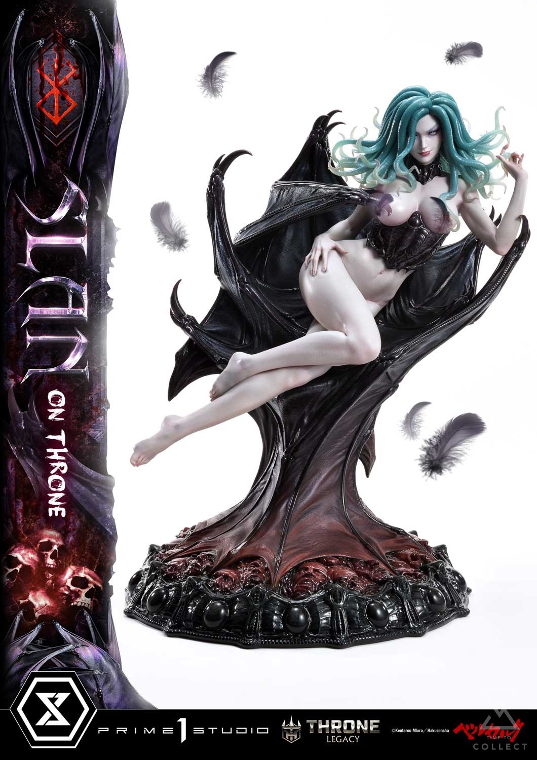 As the ritual “Eclipse” is initiated, the guardian angels of desire known as the “God Hand” is summoned. Screams and cries fill the air as the “Whore Princess of the Uterine Sea” torments the poor sacrificed souls. Prime 1 Studio is thrilled to summon a new taste of evil to the Throne Legacy lineup, introducing the TLCBR-01S: Berserk Slan Bonus Version! Slan lies on her throne made of black leathery wings with a bewitching gaze, seeking her next victim to quench her endless lust for love, hatred, pain, and pleasure. Let’s see how her chaotic beauty is expressed in this meticulous statue. Her left hand runs through her blueish snake-like hair, as her right hand gently grips the flesh of her ghastly-colored, but smooth thighs. The black corset-like attire around her waist has specifically designed patterns to highlight her perfect curves. Her facial expression shouts complete confidence with a touch of cunning evil, as her glossy lips and purple seductive eyes show her as a master of manipulation, luring others into her sinister web of lust. The black gothic base of this 1/4 scale statue is finished with a shiny touch. The petrified faces of her devoured victims, forming a macabre mosaic beneath her feet, are a haunting testament to her insatiable appetite for suffering and chaos.
