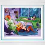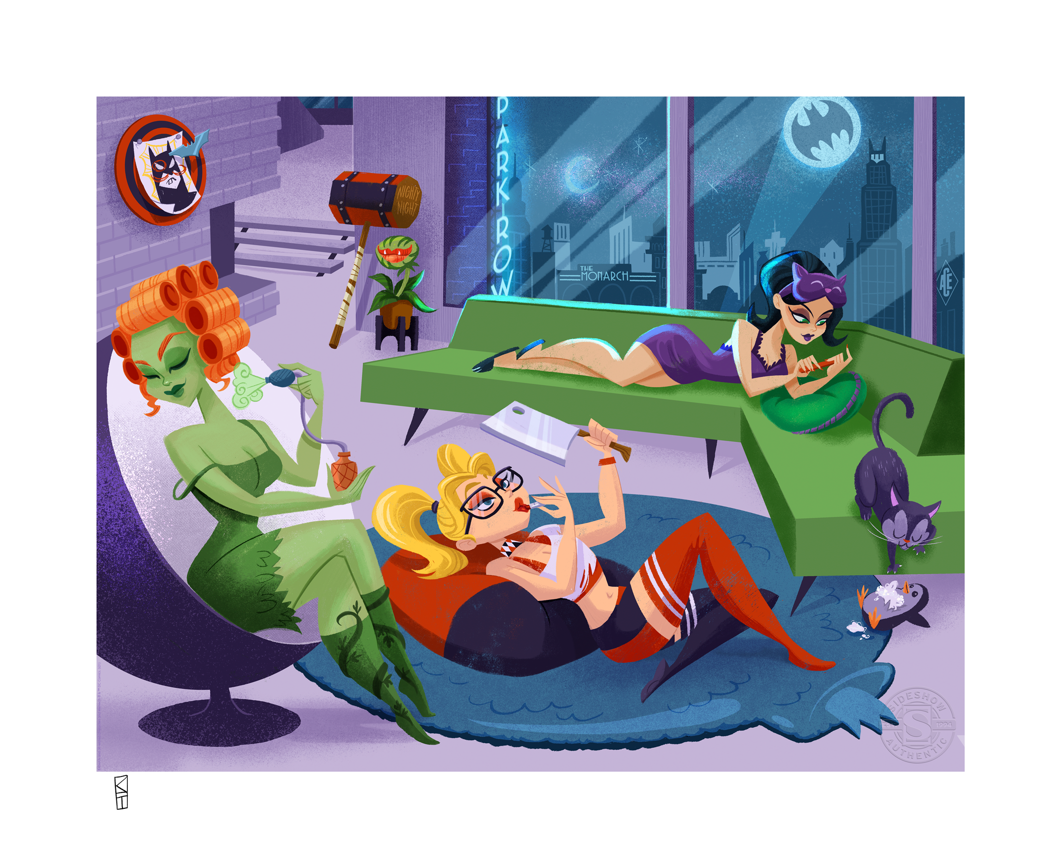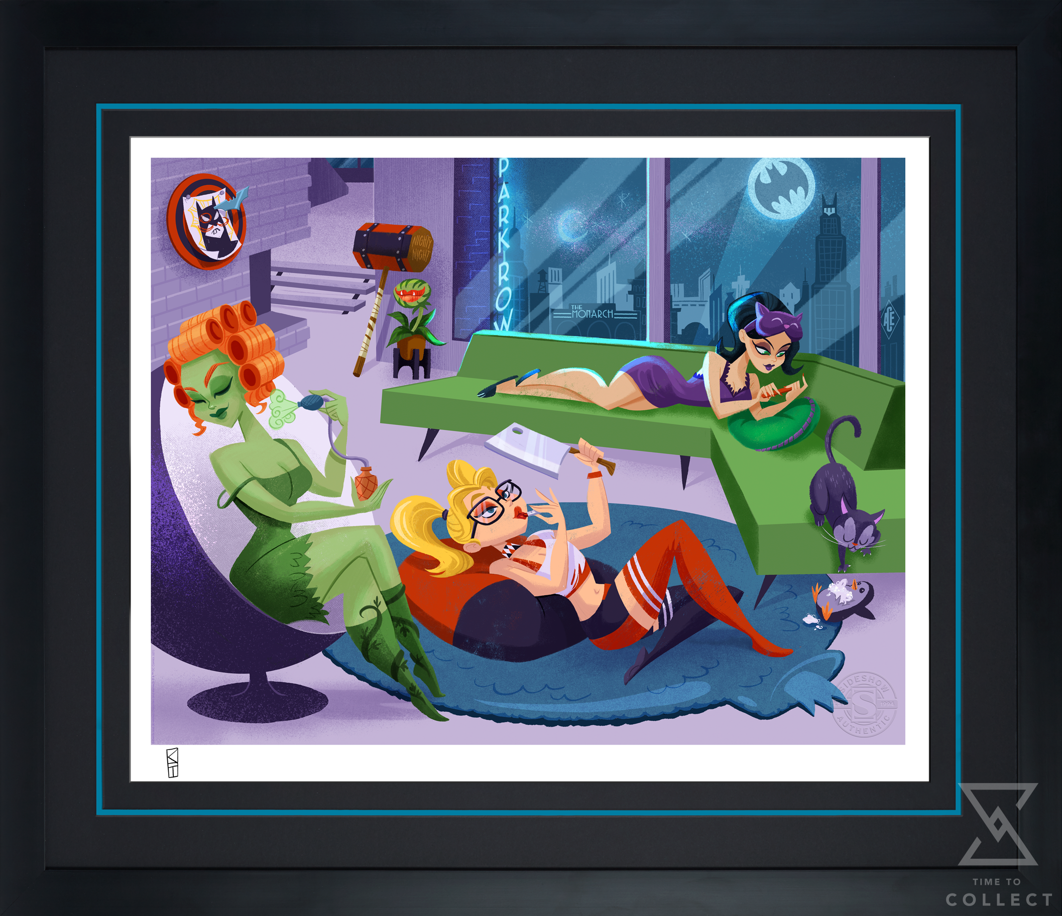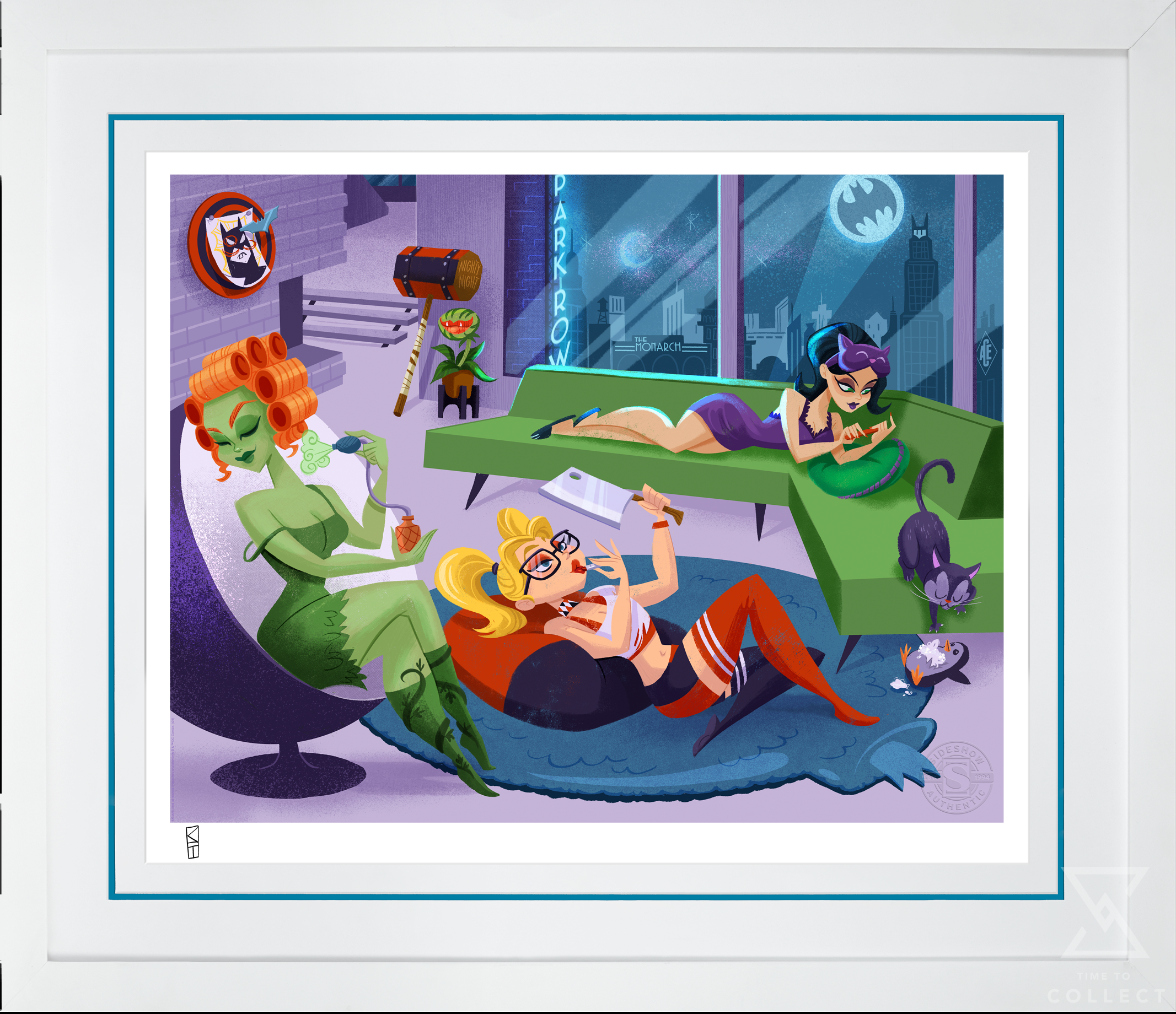 They say there’s no rest for the wicked, but Gotham City’s most famous femme fatales get the night off in this colorful composition illustrated in Hudson’s signature retro-futuristic style. Cozy up with Catwoman, Harley Quinn, and Poison Ivy as they settle in for a sleepover above the crime-ridden streets. While Pamela tries out her perfume, Selina sharpens her claws and Harley uses a meat cleaver as a mirror to give herself a stylish makeover. Packed with Easter eggs and finished with a glistening Gotham skyline, this fun and flirty fine art print is a must-have for fans of DC Comics and Batman’s rogues gallery.