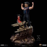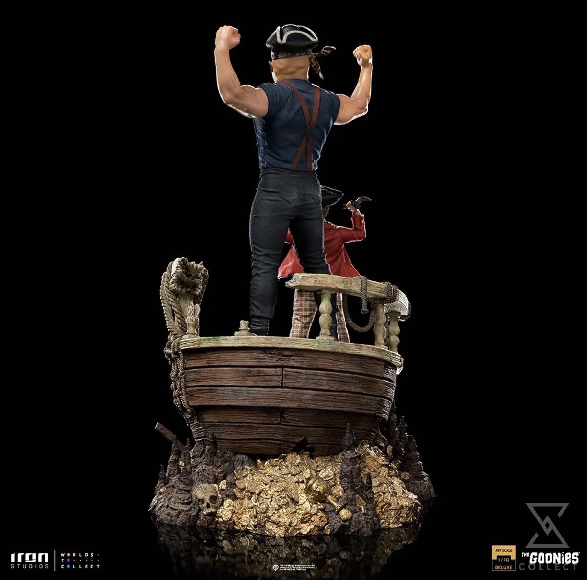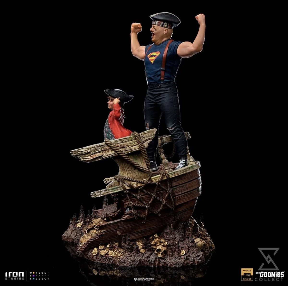 After a grand scene entrance, sliding down the sail of an old pirate galleon ship, a sturdy and joyful boy, and his newest friend, a giant with a frightening deformed face and limited intellect, but with a good heart, raise their arms in a gesture of strength and triumph. With both wearing pirate hats, the charismatic boy with curly hair smiles holding a curved dagger, while his mighty partner also expresses excitement showing his strength with his muscular body and displaying on his chest the letter “S”, the symbol of the superhero he admires and the initial of his name. From the classic cult film from the 80s, Iron Studios proudly present their statue “Sloth and Chunk Deluxe – The Goonies – Art Scale 1/10”, with the beloved duo of heroes, members of the group of young bounty hunters, over a diorama pedestal of the stern of an old pirate ship, deteriorated by time, revealing its secrets such as the part of a treasure, skulls of its old crew members, and hiding the skeleton with medallion of its captain, One-Eyed Willy.