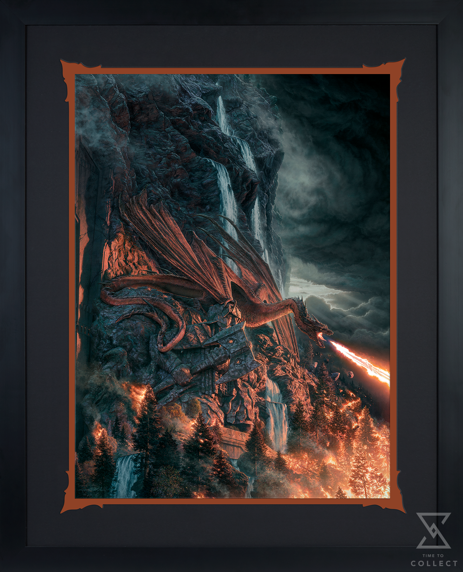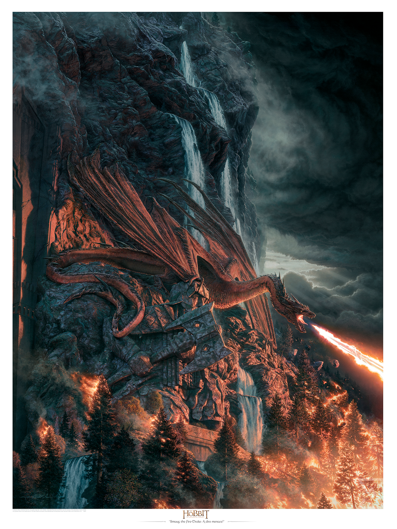 This Fine Art Paper fantasy art print features Smaug the Fire-Drake, as seen in the Hobbit films and inspired by Weta Workshop’s beautiful sculpture of this famous character. The scene takes place moments before Smaug takes to flight from the gates of Erebor, to exact revenge upon the men of Laketown.
