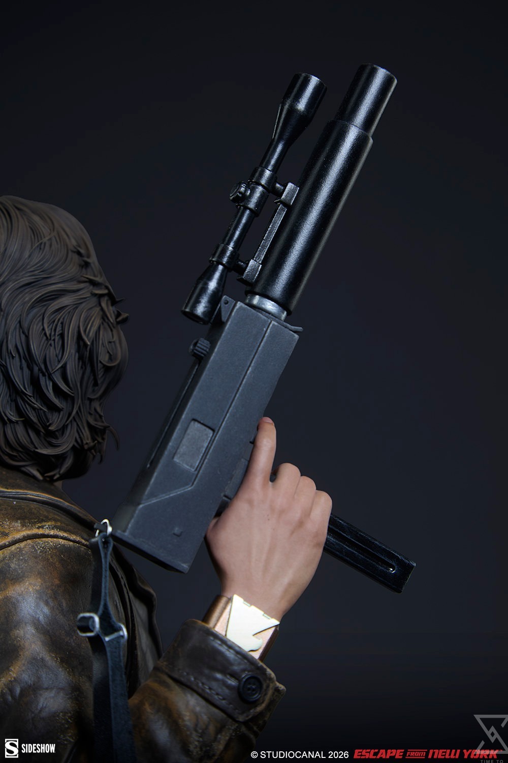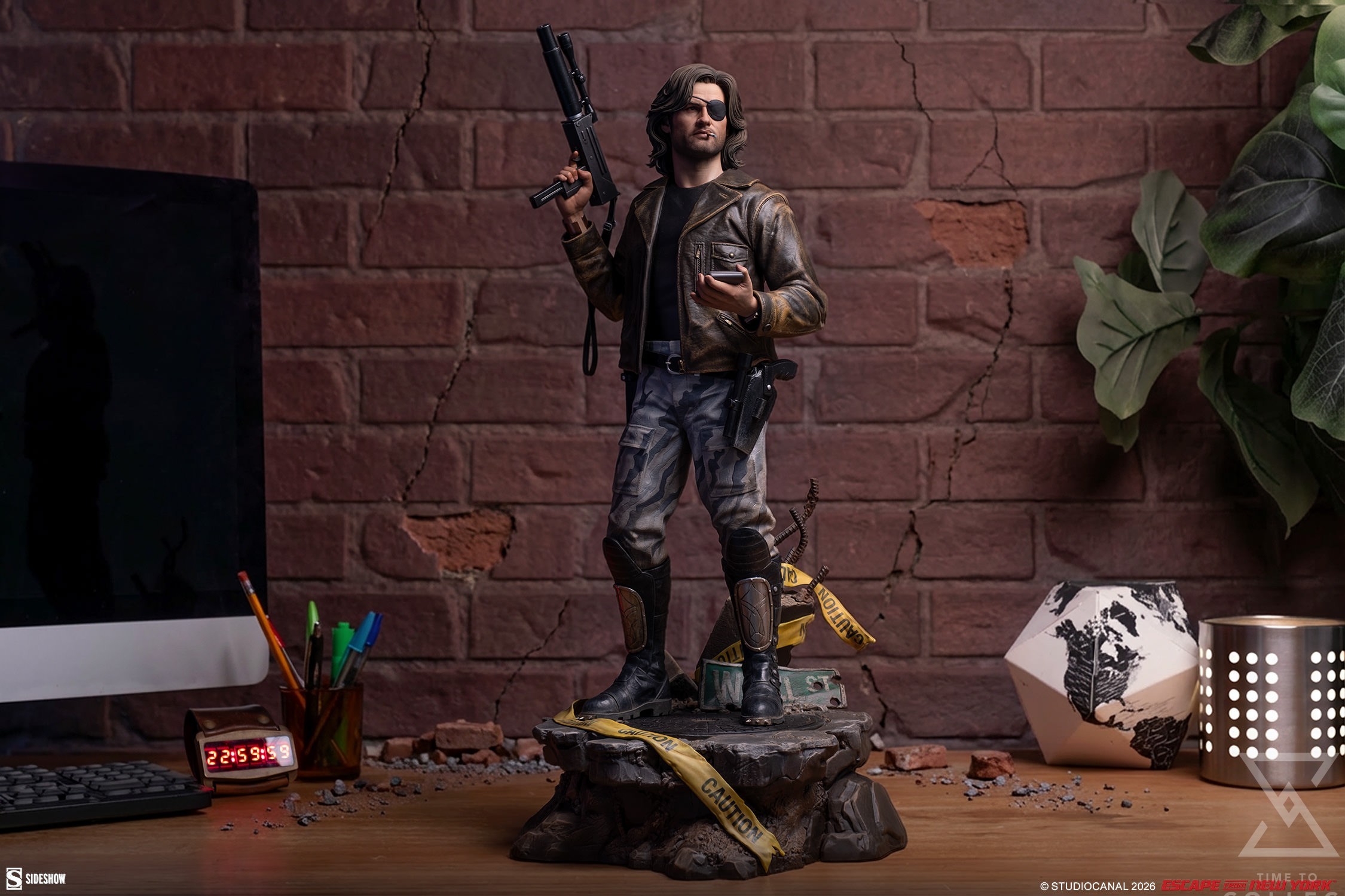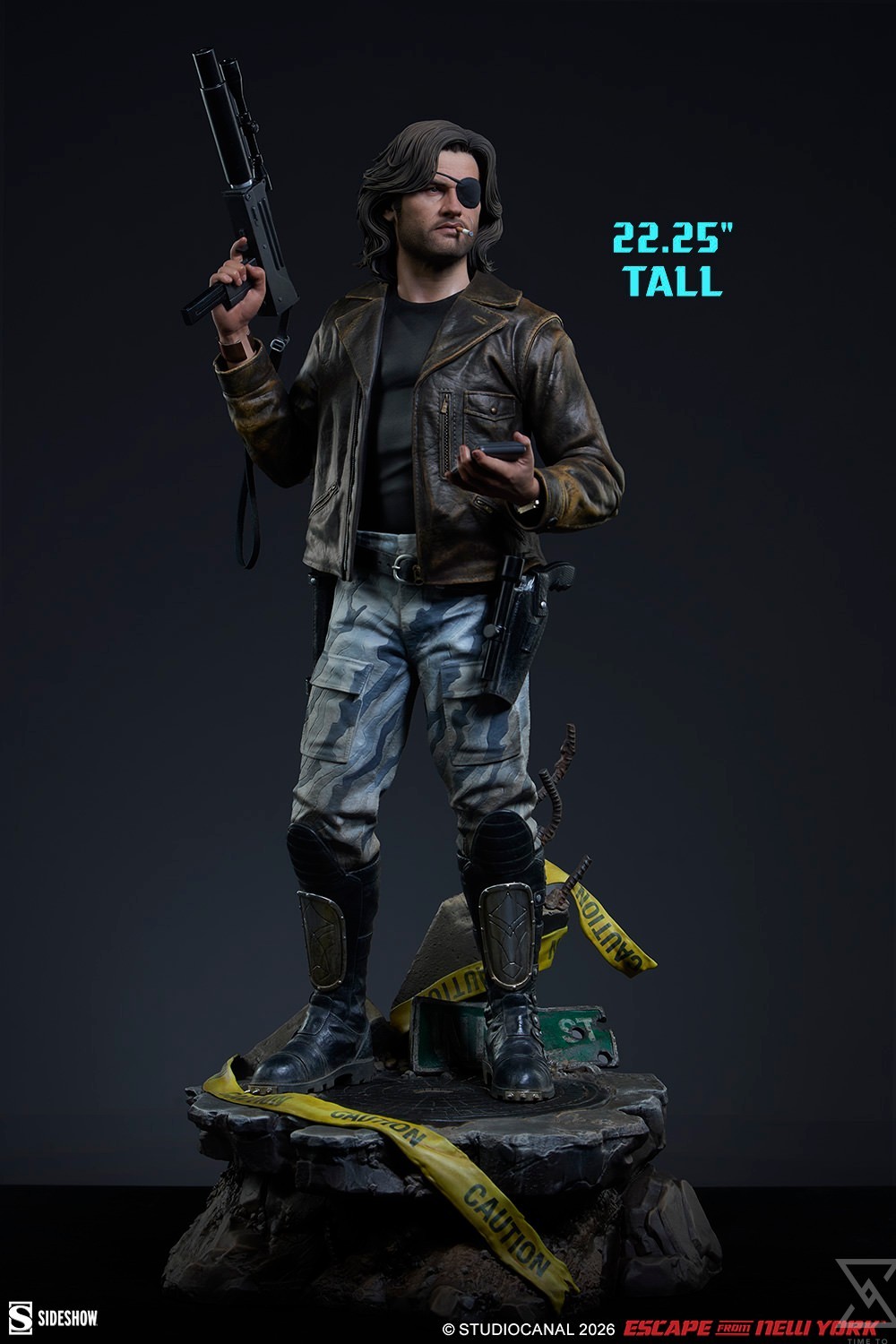The Snake Plissken Premium Format™ Figure is sculpted wearing a detailed recreation of his rugged ’80s style, including his jacket, black undershirt, gray and white camo pants, and spike-toed boots. Of course, Snake didn’t go in unprepared — the statue also features his belt and gun holsters, a tracker in his left hand, a submachine gun with silencer and scope (soft fabric strap included) in his right hand, and the Life Clock countdown timer on his wrist to ensure he stays on task. A detailed portrait completes his iconic silhouette with an eyepatch, cigarette, facial hair, and styled mullet, all ready for action.