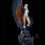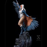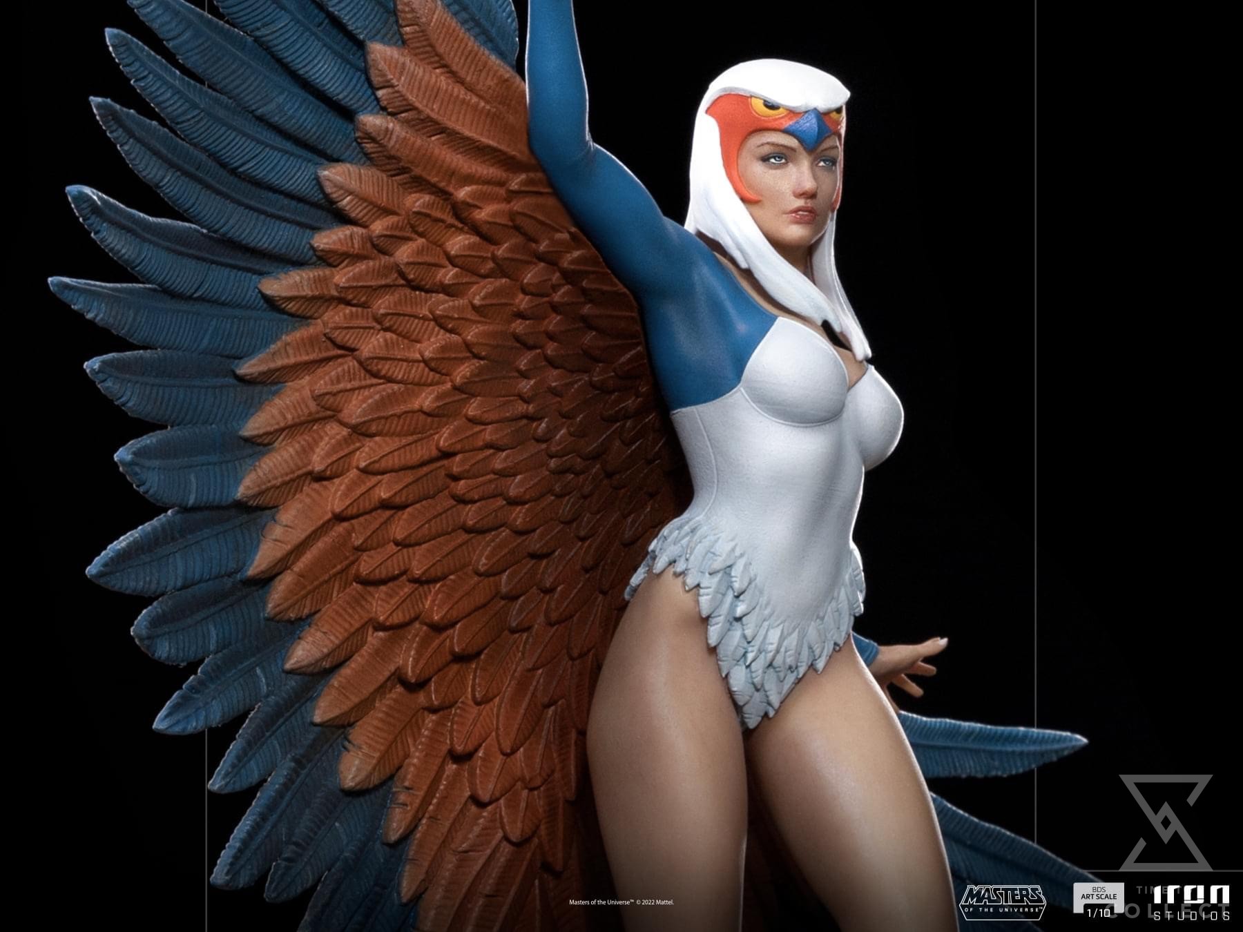 Exceptionally powerful within the limits of the castle of which she is the guardian, the beautiful sorceress raises her arms, opening part of the big wings with blue and orange feathers that compose her costume. Wearing a type of swimsuit and blue and white boots, with her head covered by a helmet in the shape of a falcon’s head, she gestures using her wide range of magic skills, while going down the stairs of Castle Grayskull. Thus, Iron Studios present the statue “Sorceress BDS – Masters of the Universe – Art Scale 1/10”, with the wise and altruistic watcher of the secrets contained in Eternia’s ancestral fortress, and He-Man’s counselor and mentor.