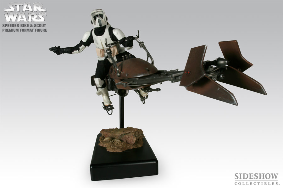 The Premium Format 1:4 Scale Speeder Bike and Scout Trooper figure is akin to the stop motion maquettes used in the making of the famous chase sequence in Return of the Jedi. Every detail of the speeder bike and scout trooper has been accurately recreated in 1:4 scale, utilizing a mixture of materials to capture the proper look and feel. The bike is cast in heavy-weight polystone and white metal, and is mounted on a sturdy support rod. The body of the biker scout is cast in high-density foam, and incorporates several points of articulation so that you may adjust the pose and attitude of the trooper’s head and arm. The trooper is costumed in a real fabric body glove, then finished with polystone and metal armor elements. The display base is cast in heavy-weight polystone, and finished on the base bottom with individual hand numbering.