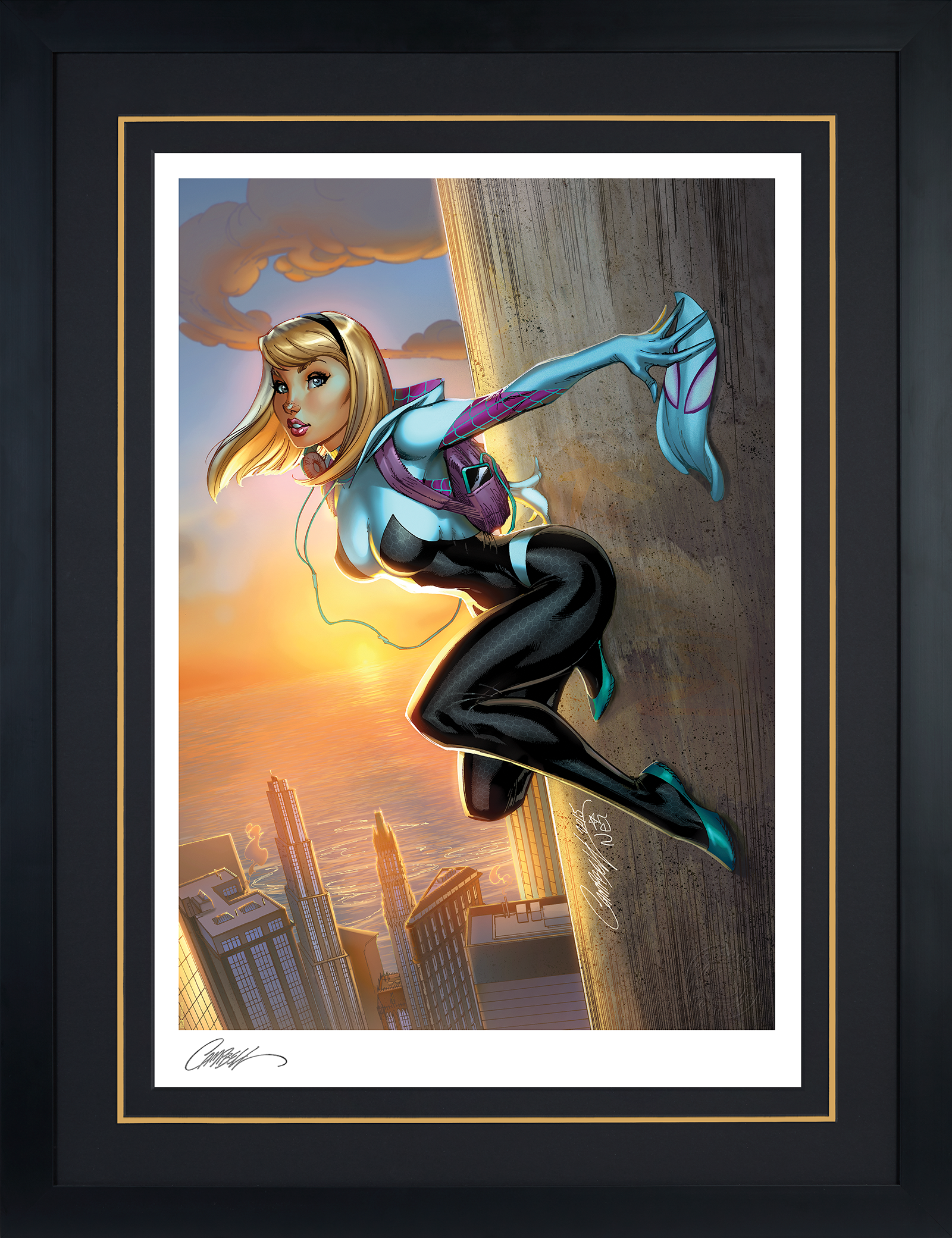 Originally created as a JSC Store exclusive cover to Spider-Gwen #1 (2015), written by Jason Latour for Marvel Comics, fans can now bring home this gorgeous Gwen Stacy illustration in a fine art format. Each Spider-Gwen #1 Fine Art Print is hand-signed by J. Scott Campbell and features an embossed Seal of Authenticity as a part of the limited edition of 250 piece. Available as an unframed giclée or in a custom framed presentation, this Marvel artwork is a must-have for fans of the Spider-Verse and Campbell’s iconic comic book covers!