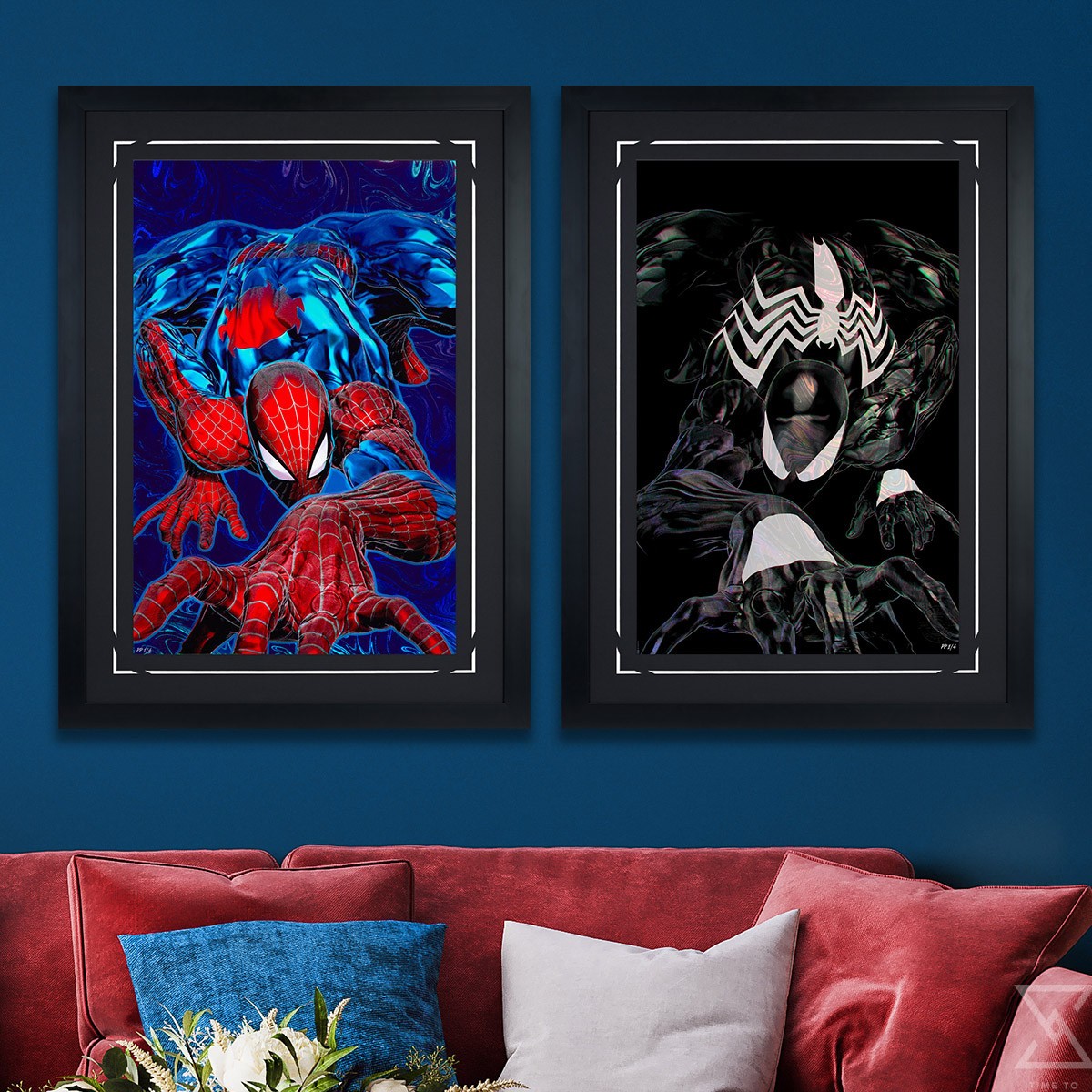 Look out — here comes the Spider-Man! Lithe and acrobatic, Peter Parker is as stealthy as an arachnid as he wall-crawls his way towards the viewer. Artist John Giang uses detailed textures and dynamic perspective to bring this iconic hero off the page and into your home in the Mighty Marvel Manner. The Spider-Man ’94 illustration features Spidey’s classic blue and red costume with the short-legged spider logo on the back. Exclusive to the bundled set, the Spider-Man ’94: Negative Bleed Variant depicts the infamous black symbiote suit in a mirrored pose, perfect for a paired display of prints.