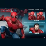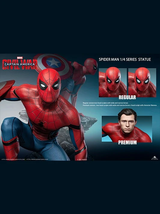 The quarter scale Captain America: Civil War Spider-Man statue is available in two versions. The standard version includes Spider-Man with a fully masked head sculpt and switch-out lenses. While the premium version includes the masked head sculpt and a life-like head sculpt with full character likeness and no mask. Both versions of this highly sough-after collectible are ideal for the discerning collector.