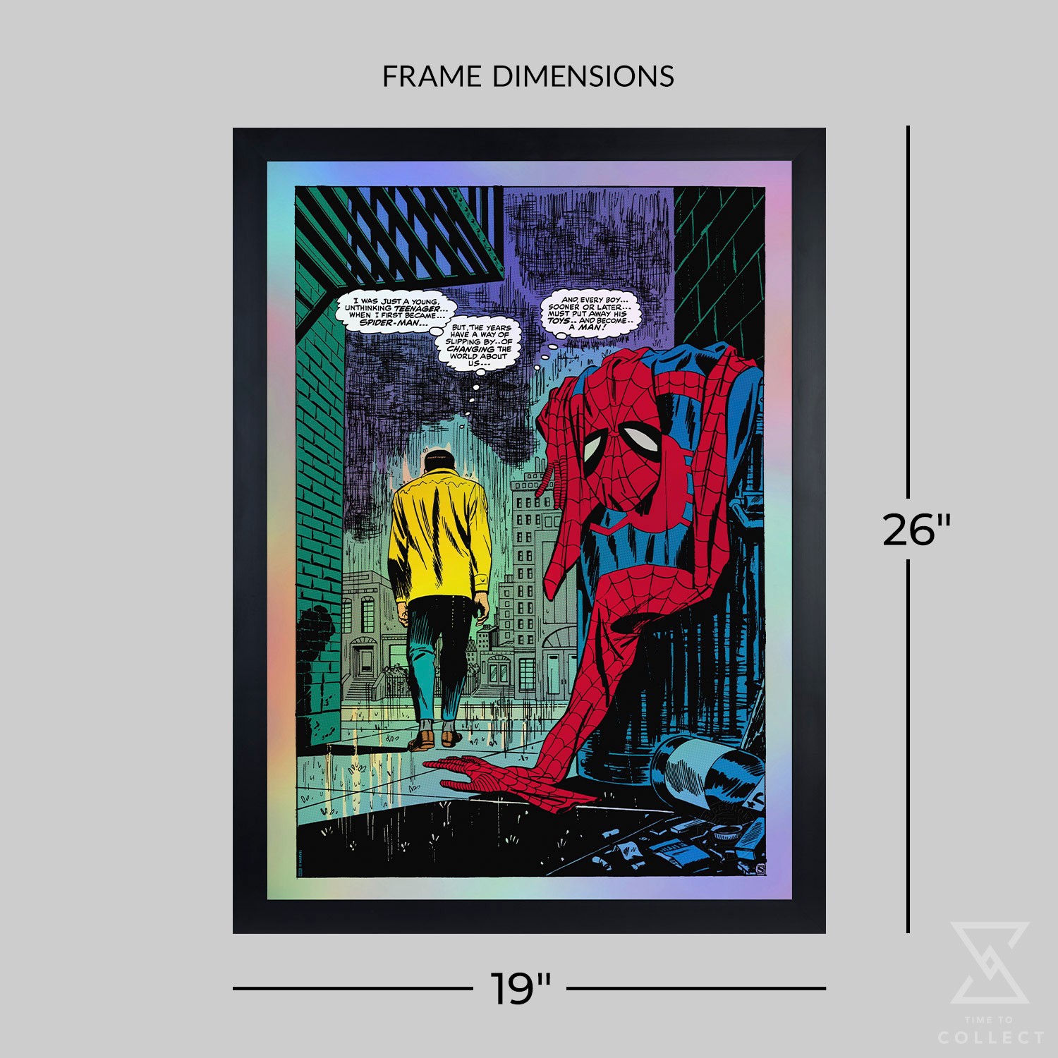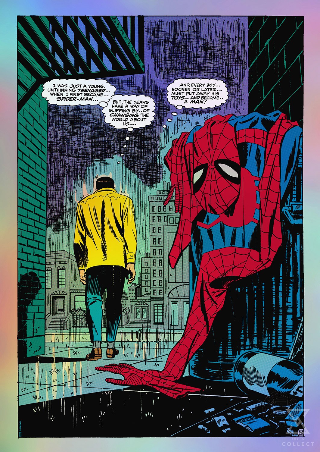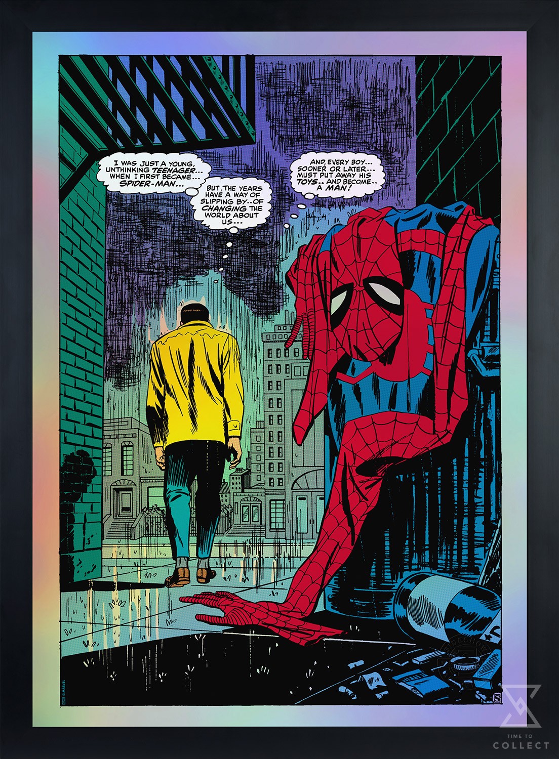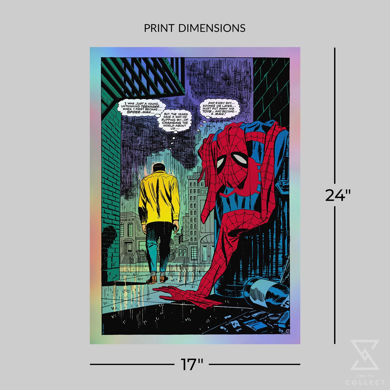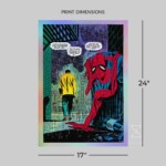 Sideshow presents the Spider-Man No More Variant Screenprint by artist John Romita Sr. Originally published on page 8 of the landmark issue The Amazing Spider-Man #50 (1963), written by Stan Lee for Marvel Comics, this iconic Marvel art captures Peter Parker during his greatest crisis — one of identity and ideals. The rainbow holofoil paper presentation makes a vibrant and unique addition to any home gallery.