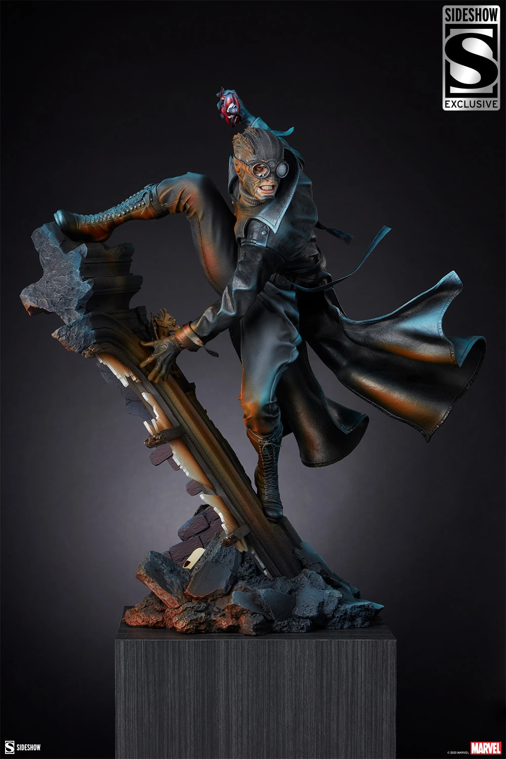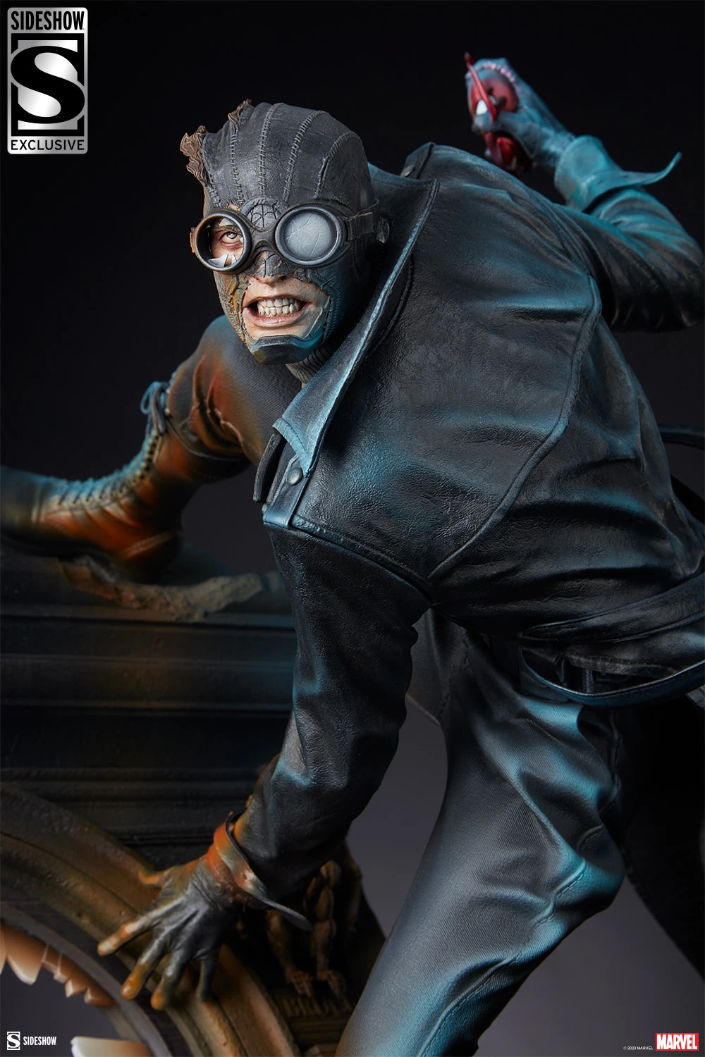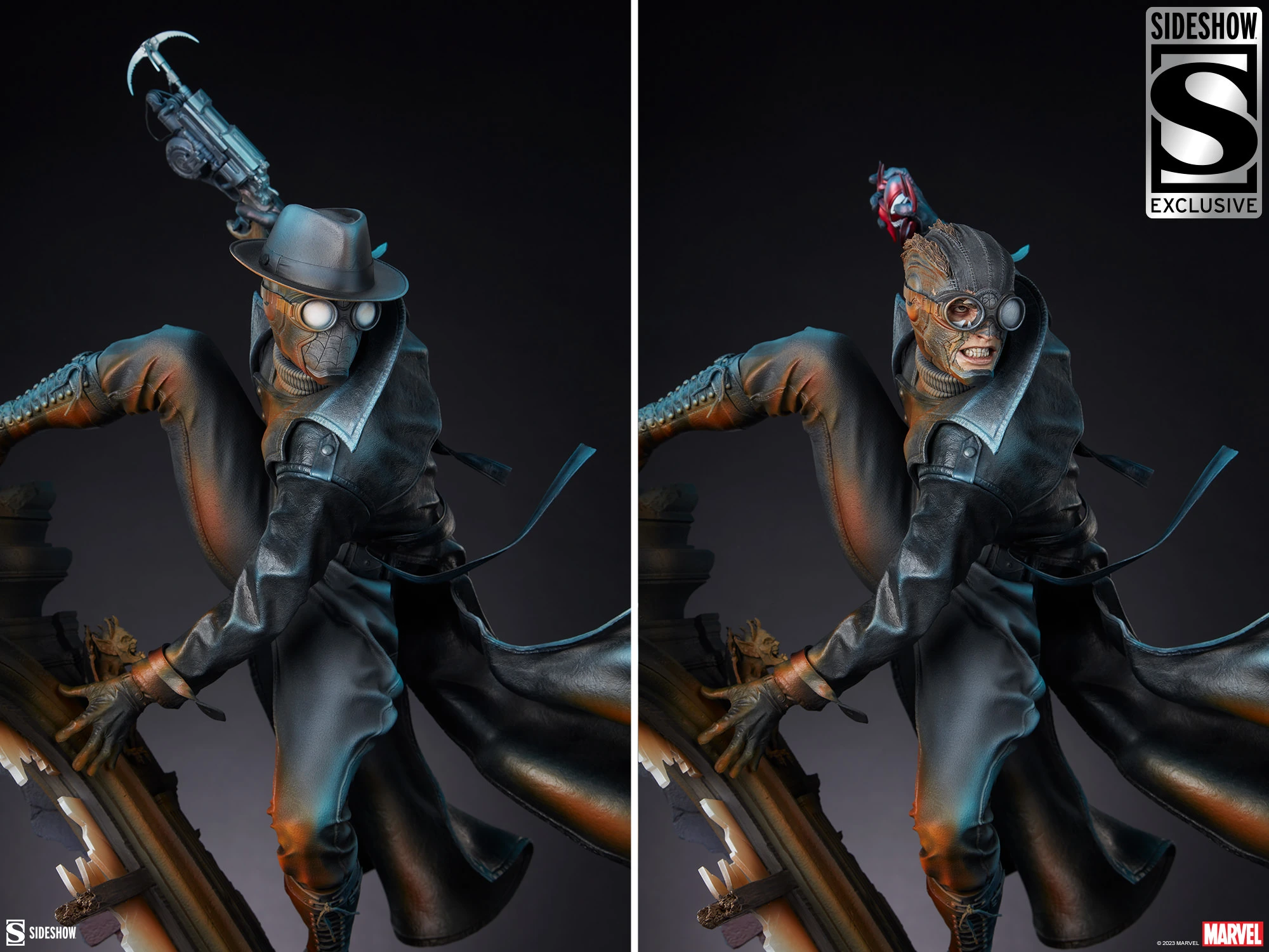The Sideshow Exclusive Edition of the Spider-Man Noir Premium Format Figure includes a swap-out battle-damaged portrait showing Peter Parker partially unmasked in his fight against crime. He also comes with an alternate right hand holding part of the Spider-Idol, an ancient relic responsible for empowering Marvel Noir’s version of Spider-Man with the curse of great power.