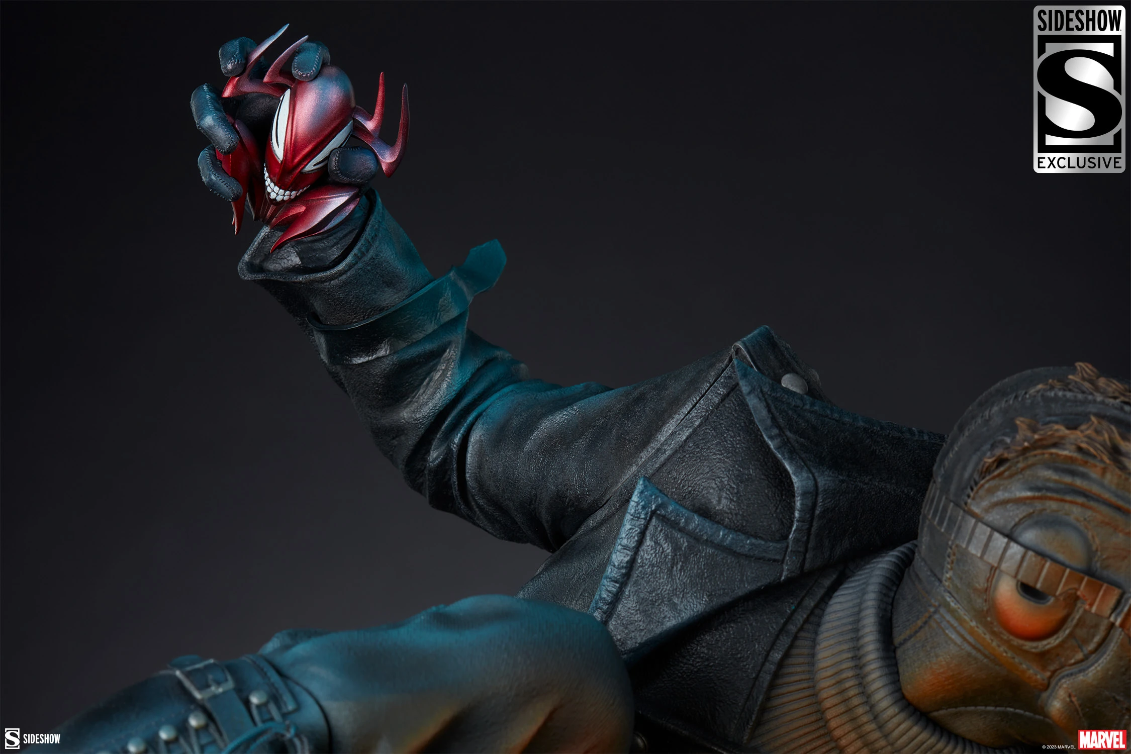 SIDESHOW EXCLUSIVE = Swap-out battle-damaged portrait and alternate right hand holding part of the Spider-Idol.