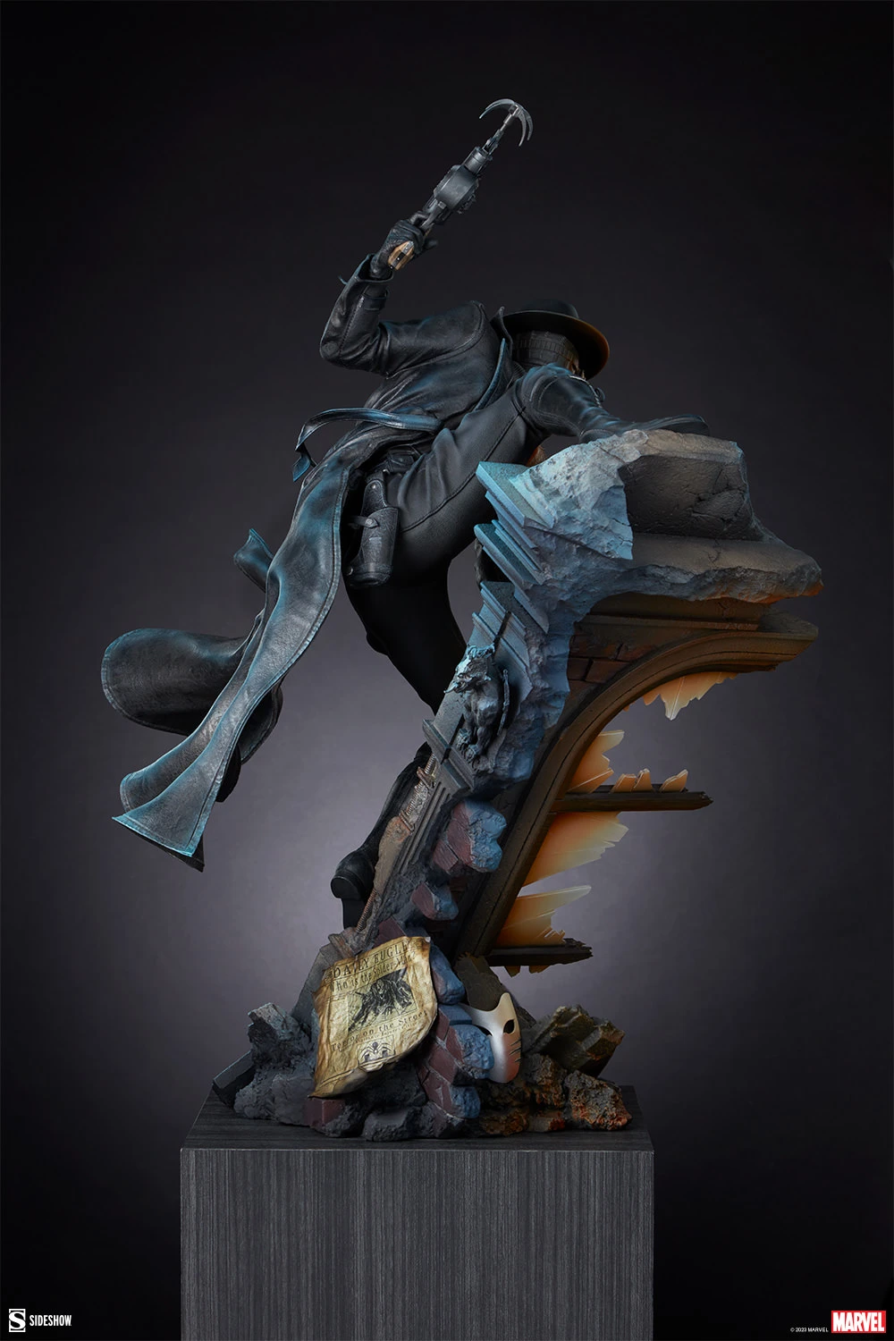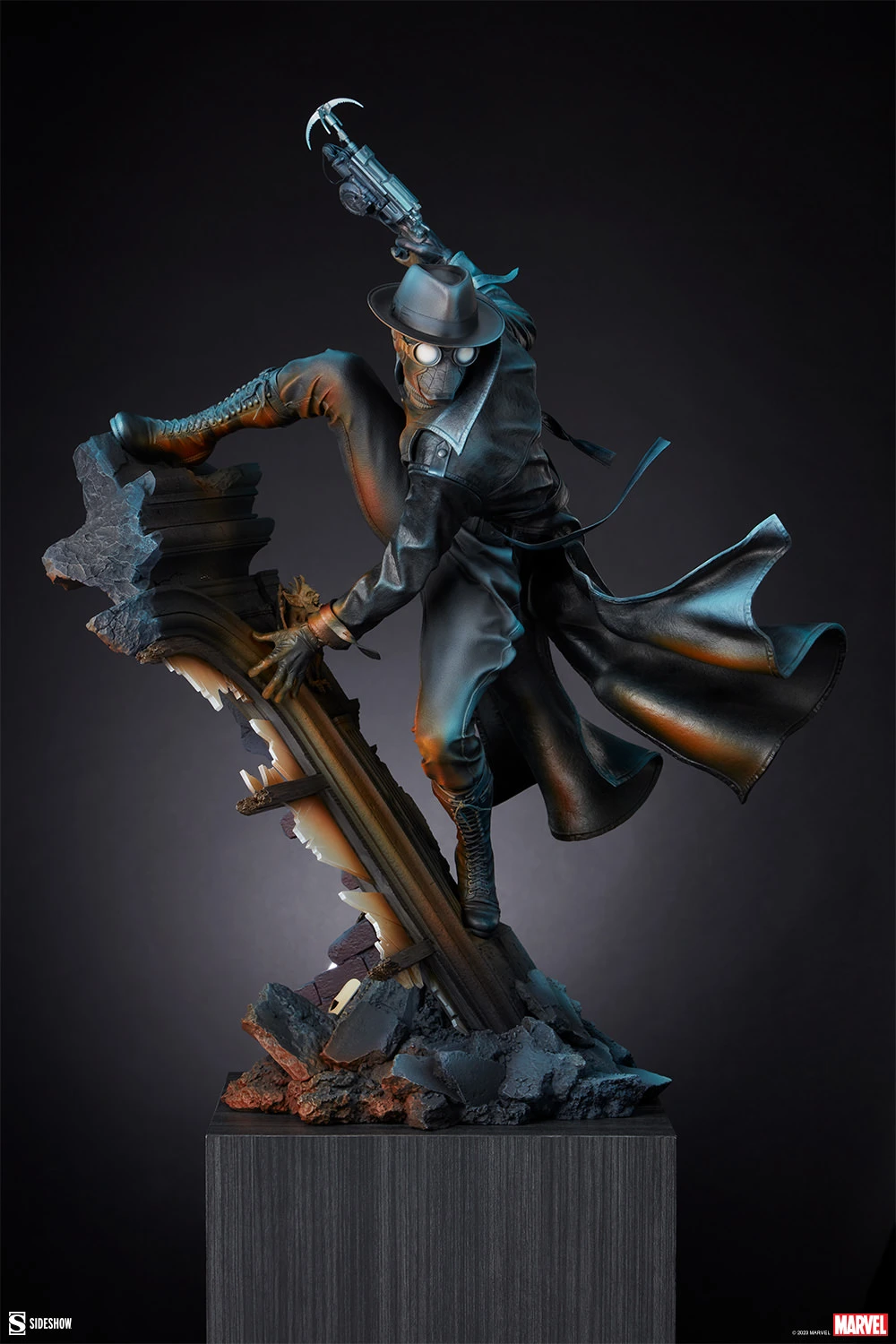The Spider-Man Noir Premium Format Figure is fully sculpted and meticulously painted to evoke a dramatic, windswept wall-climber’s adventure through the city skyline. Peter Parker’s costume features a dark leather-like trench coat, turtleneck shirt, pants, boots, and his intricate Spider-Man mask complete with a fedora. Theatrical paint design uses warm orange tones to evoke interior light emanating from inside the building, while blue highlights emphasize the folds of his costume and the film noir-inspired aesthetics of this alternate Earth.