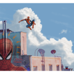 It’s a bright morning in New York City, and Peter Parker has already donned his classic red and blue costume to fight crime. Spider-Man leaps high into the fluffy clouds and soft morning sky while using his webs to swing over sunlight-soaked buildings and satellite dishes. Below, a graffiti mural depicts the city’s famous hero with his Spidey-senses tingling.