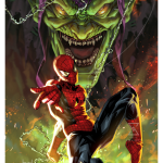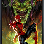 Down came a rain of fire to wash the spider out! Peter Parker must face the sinister onslaught of Norman Osborn in this perilous portrait of iconic archenemies. While Spider-Man swings through a green haze from exploded pumpkin bombs, the Green Goblin’s monstrous face looms large and laughing behind him. It’s an endless battle of great power against great evil, as the friendly neighborhood hero fights to protect the people he cares about most.