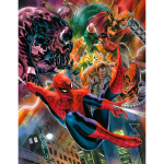 In the Spider-Man vs the Sinister Six Fine Art Print, a red-and-blue clad Spider-Man swings through New York while being pursued by his most famous foes. A dark, vibrant cityscape expands below the web-slinging hero, while his enemies form a vivid spectrum of villainy above. Included in this deadly roster are Venom, Mysterio, Vulture, Lizard, Electro, Sandman, Doctor Octopus, Green Goblin, Kraven the Hunter, and Hobgoblin, all of whom have claimed membership in the Sinister Six over the years.