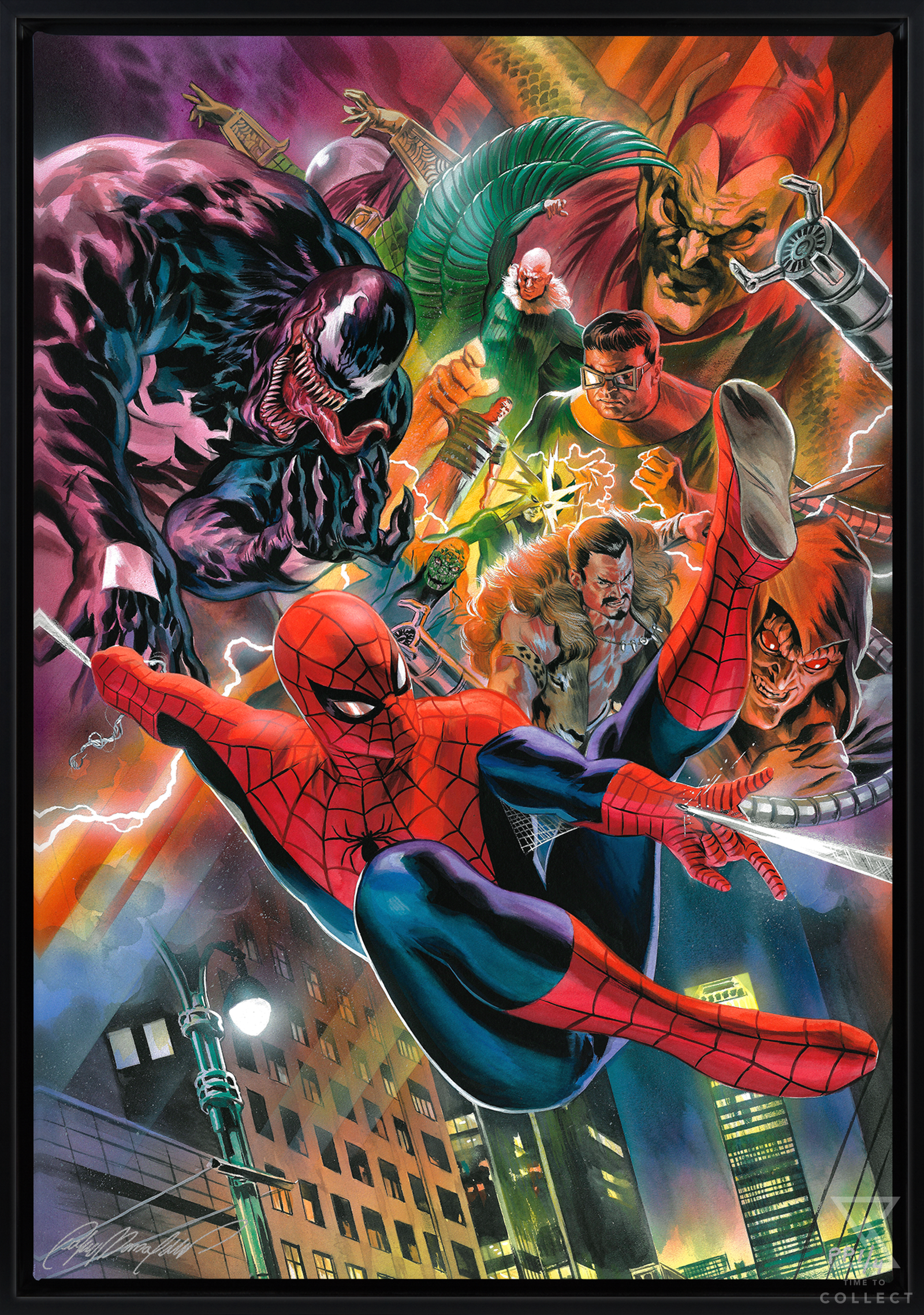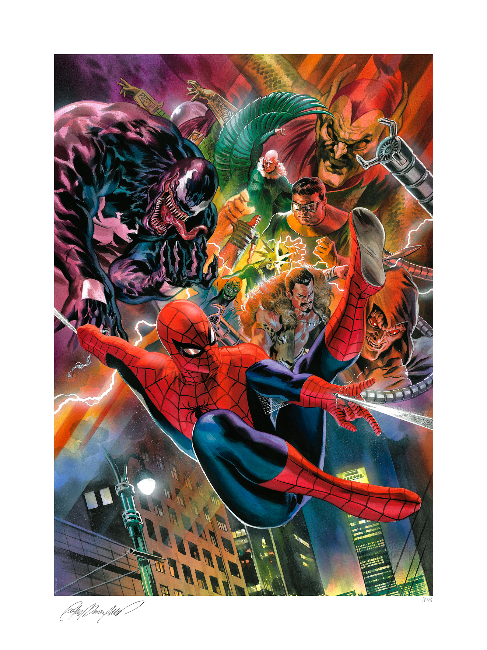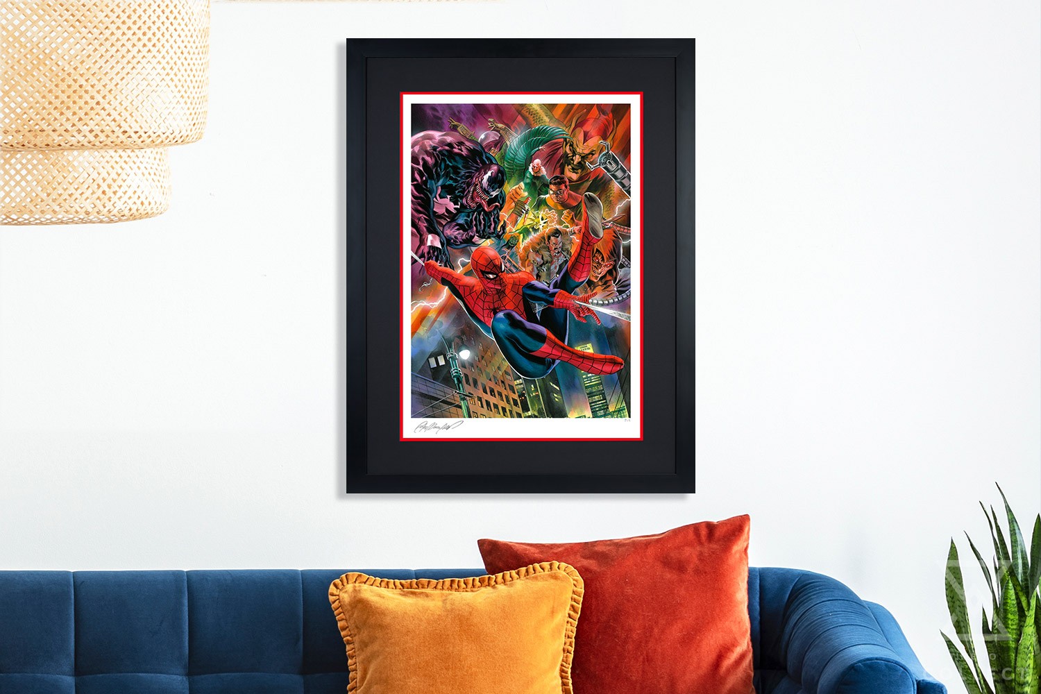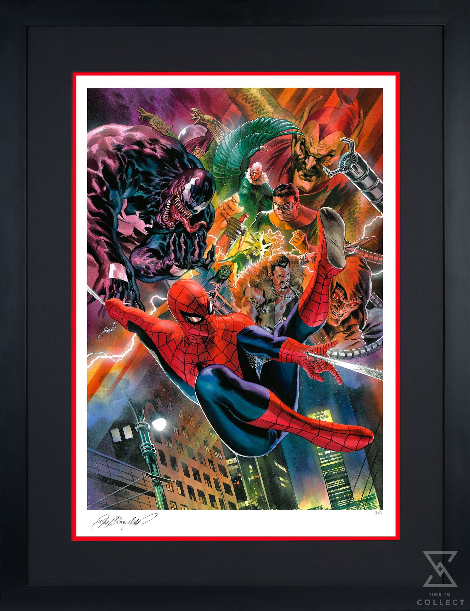 Originally created as a variant cover for the milestone 900th issue The Amazing Spider-Man #6 (2022), written by Zeb Wells for Marvel Comics, this Spider-Man art is now available to fans as an unframed giclée print or in a custom framed presentation. Each Spider-Man vs the Sinister Six Fine Art Print features an authorized, automated artist signature and an embossed Seal of Authenticity as part of the limited edition of 250 pieces.