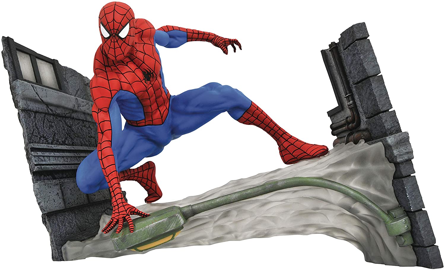 Spider-Man returns with an all-new sculpt in the Marvel Gallery PVC diorama line! Crouched on a web slung across an alleyway, Spider-Man lives up to his namesake in this all-new PVC sculpture portraying the hero in his element. Measuring approximately 7″ high by 11 ” wide, this detailed sculpt by Alterton is based on a design by Caesar, and comes packaged in a full-color window box.