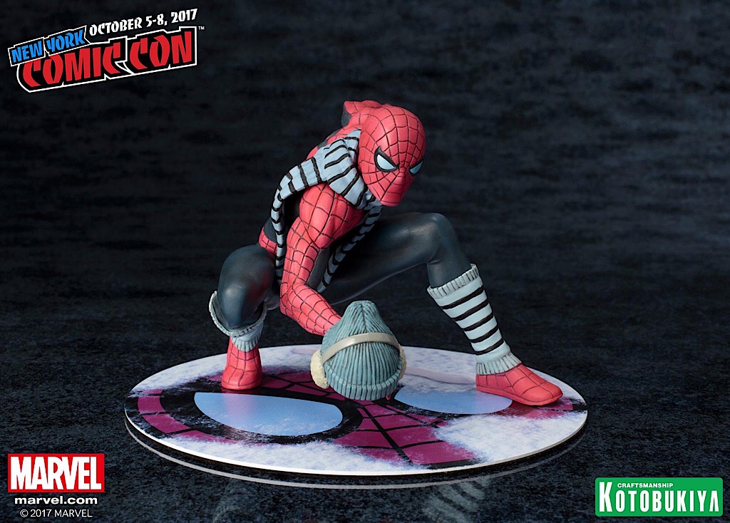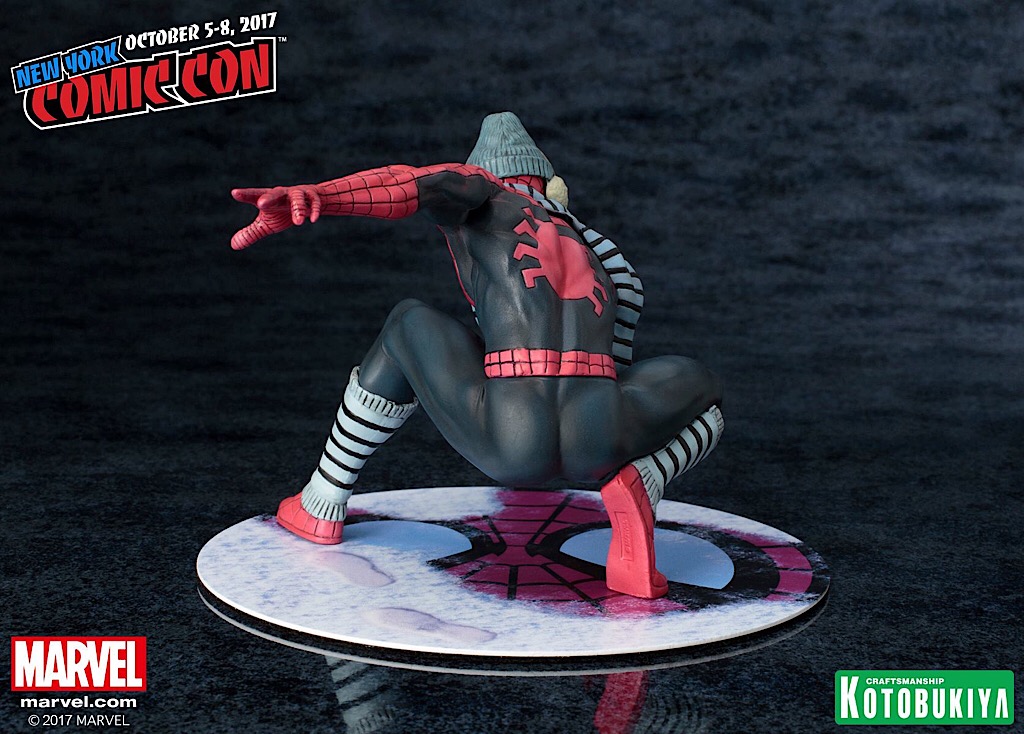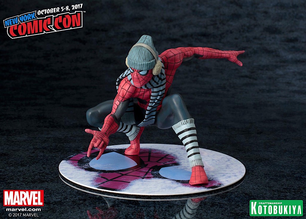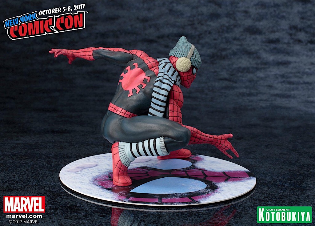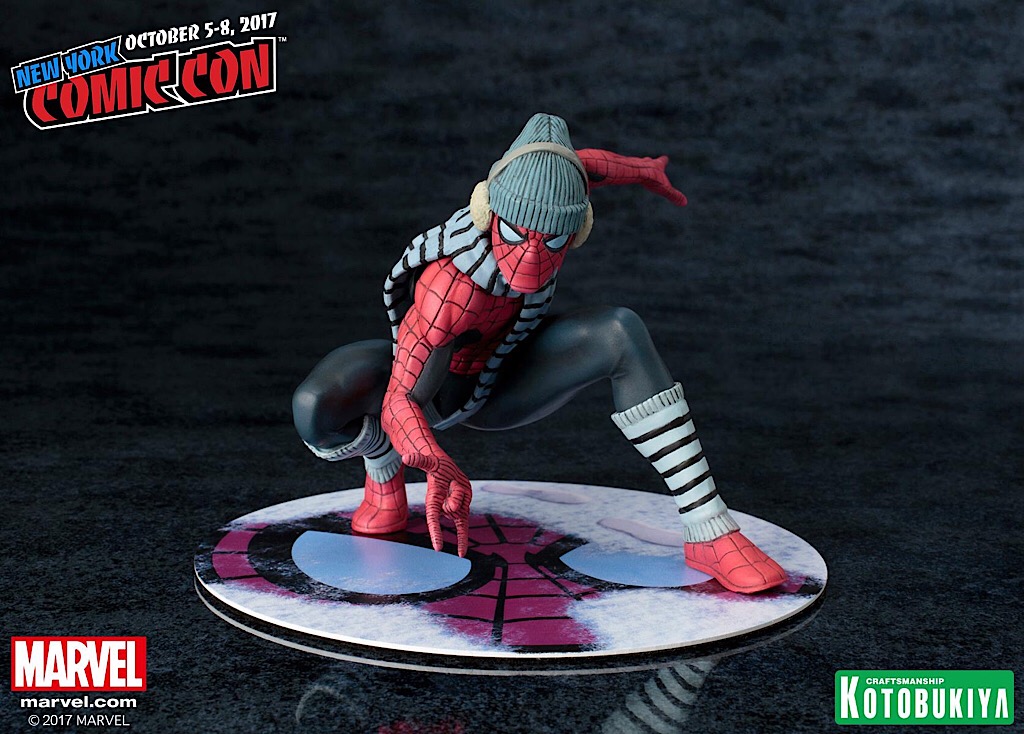 Straight from The Amazing Spider-Man #615, our web-slinging hero dons his winter gear to combat the cold while swinging through the South Bronx one particularly chilly evening. This New York Comic-Con limited edition ARTFX+ statue features a brand-new paint deco and sculpted outfit on Spider-Man which includes a removable scarf and beanie with earmuffs along with a specially designed magnetic “snowy” base.