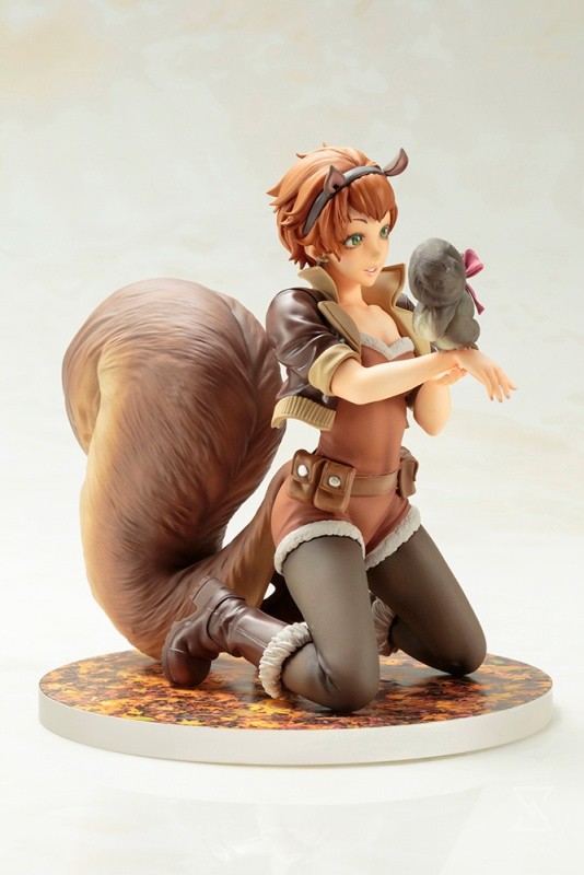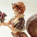 Doreen celebrates her squirrel love as she takes a break from her GLA duties to hang out with one of her best friends: Tippy-Toe. The unique heroine kneels on the ground in a super cute pose, resting on her knees and her toes underneath her. Squirrel Girl holds her tiny companion on her outstretched hand so she can gaze into the animal’s eyes, and of course behind her is her massive squirrel-like tail! Her distinctive costume is in full effect with olive tights, fur-lined dark brown boots and a tan one-piece outfit, a utility belt with pouches, and a short leather jacket. Squirrel Girl also wears an adorable headband outfitted with squirrel ears and acorn earrings while Tippy-Toe has her own accessory, a pink ribbon around her neck! Every aspect of this Bishoujo presentation is intricately sculpted and detailed from clothing elements to fur and hair and of course Squirrel Girl’s silly buck-toothed expression.