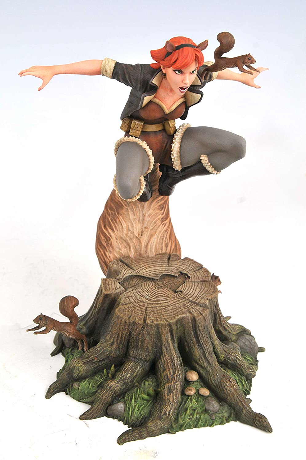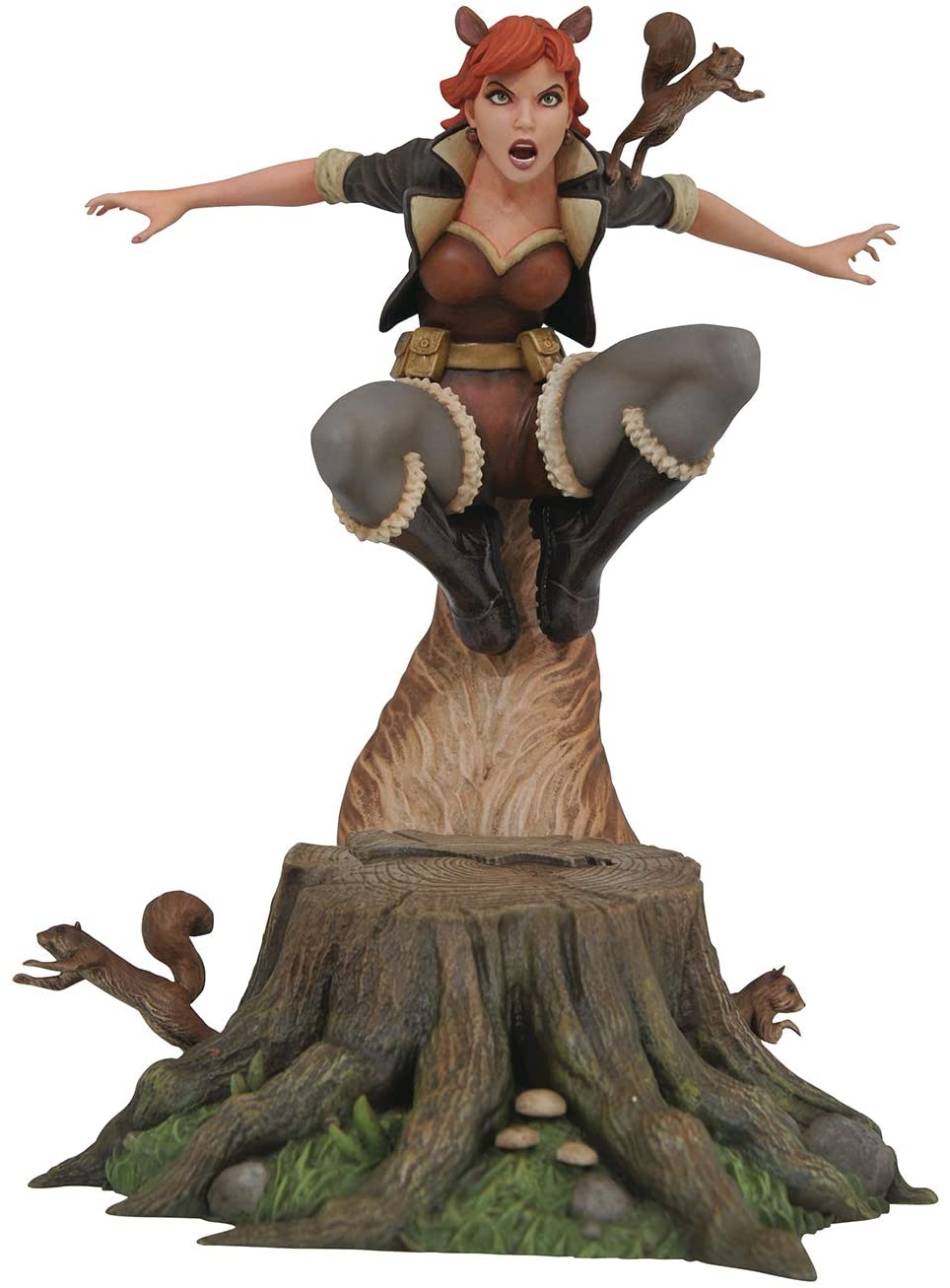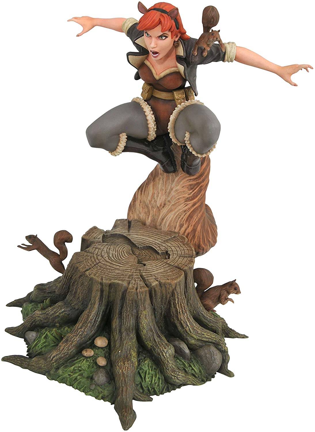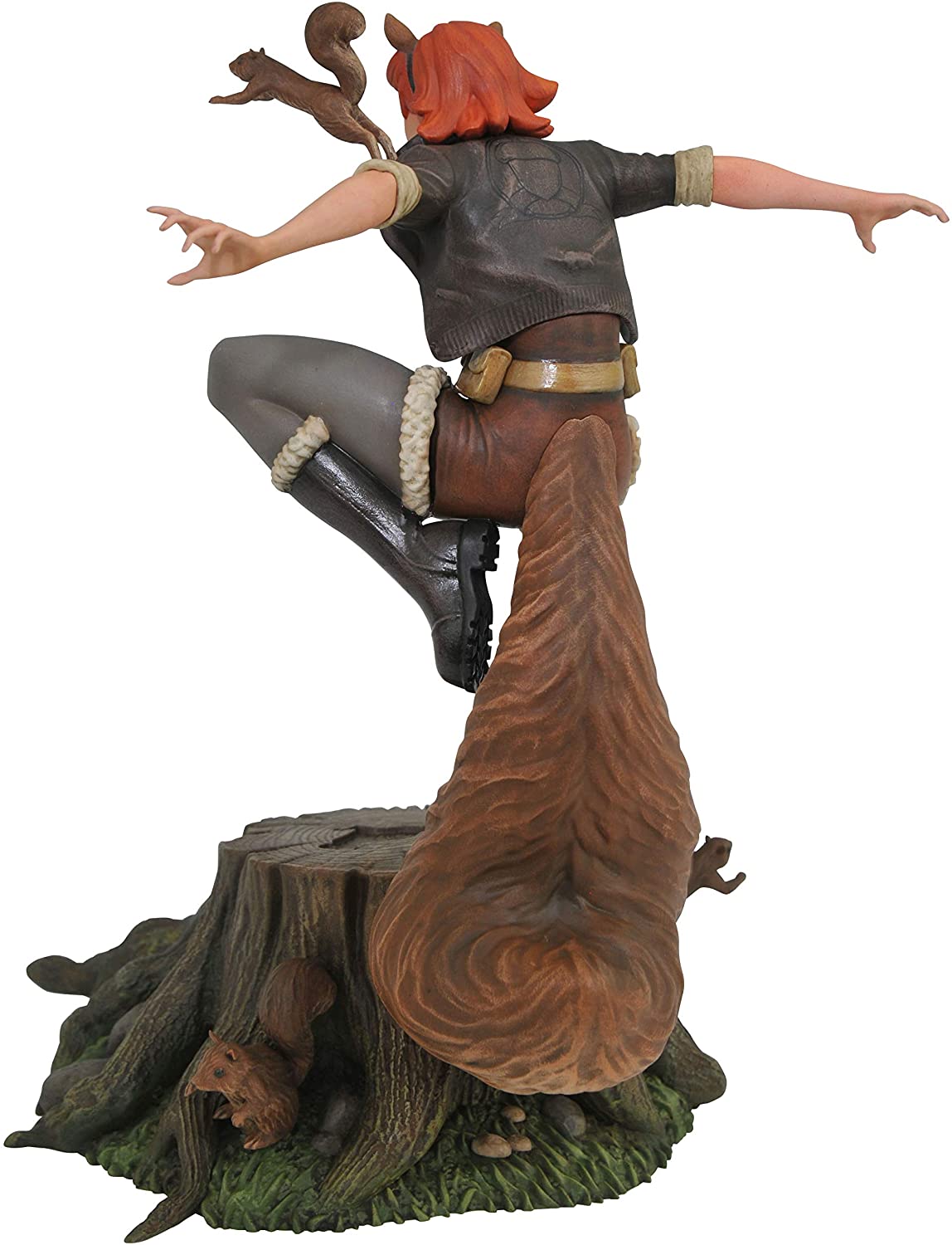 A Diamond Select Toys Release! Let go of the squirrels. And then hurry up and let this squirrel girl PVC diorama free with the superhero eating nuts and kicking butt. Doreen Green has a long and varied story in the Marvel comics universe, but today she enjoys the height of her popularity as the unbeatable squirrel girl. This detailed 10 inch sculpture shows her jump over a tree stump with Tippy Toe and her other squirrel allies, with meticulous sculpture, sculpting by Sam Greenwell based on a design by Uriel Caton. Packaged in a coloured window box.