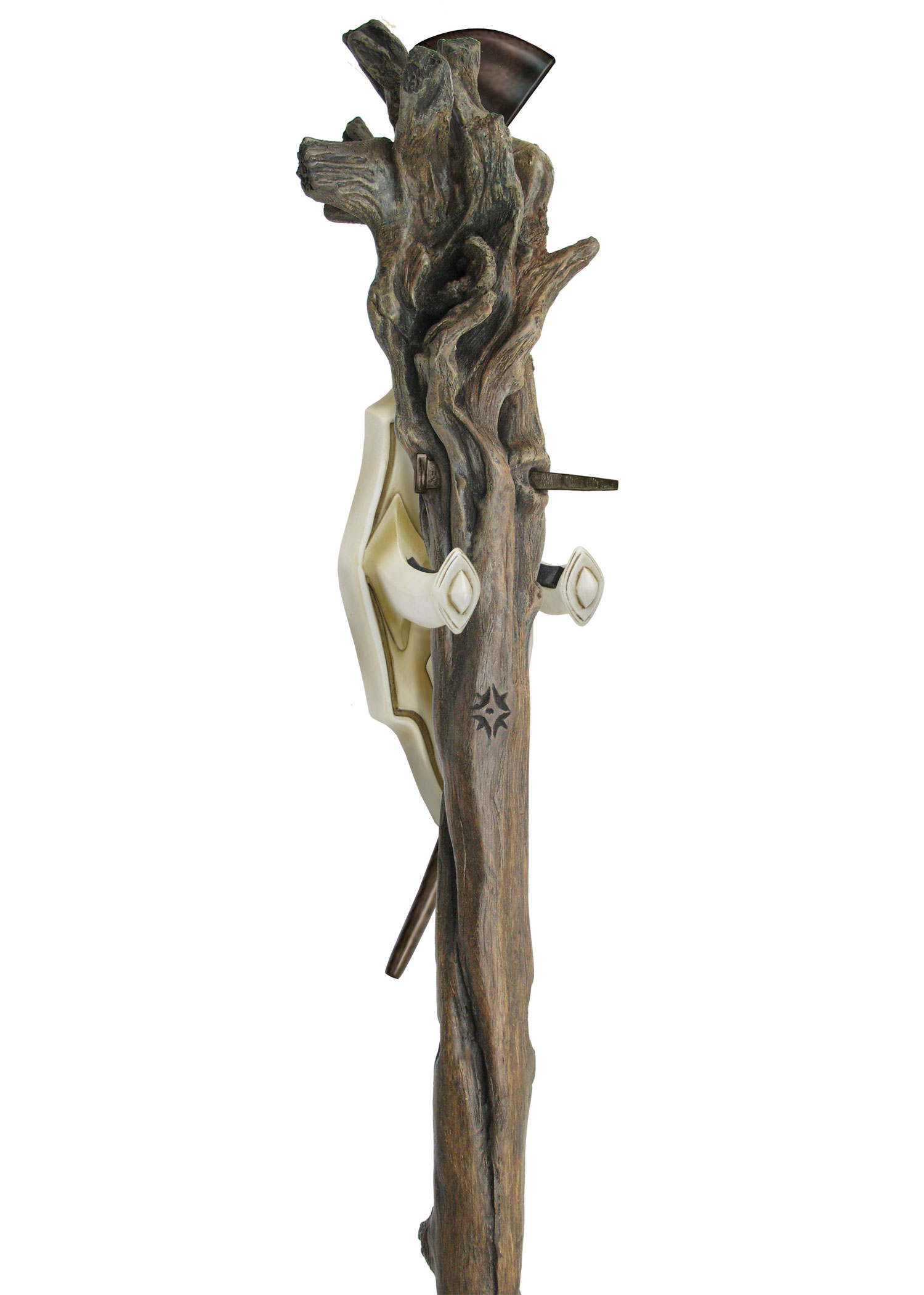 The Staff of Gandalf the Gray is a symbol of his status as an ‘Istari’, or wizard. It was once owned by Radagast the Brown, crafted from an upturned, twisted sapling once crowned with twig and root-like protrusions, but now all broken and worn down. As well as being Gandalf’s trusted walking stick and a fighting weapon when in need, it holds a deep magical power. Radagast’s rune mark is carved into the side and the crown features a grooved shape that once held Radagast’s blue crystal, now serving as a place for Gandalf to store his pipe. Pushed into the side of the staff is a nail spike which Gandalf uses as a tobacco tamper and once used to scratch a rune into the door of Bilbo Baggins home in Hobbiton.