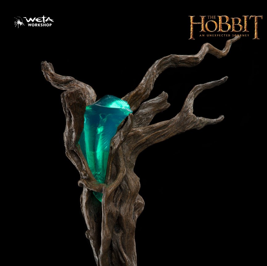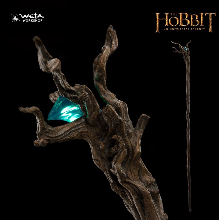 Fashioned from an upturned sapling, Radagast’s gnarled staff serves as walking stick, magical rod and practical tool for the wandering Wizard of the woods and wilds. At home amid the beasts and trees, Radagast has largely eschewed the company of men or Elves or other cultured races for the solace of the forest and the companionship of its creatures. With twiggy protrusions serving as a bird’s perch and amid which a cool blue crystal nestles, the Wizard’s twisted staff is ever at his side, supporting him on his long, and frequently spontaneous, rambles through his forest home.