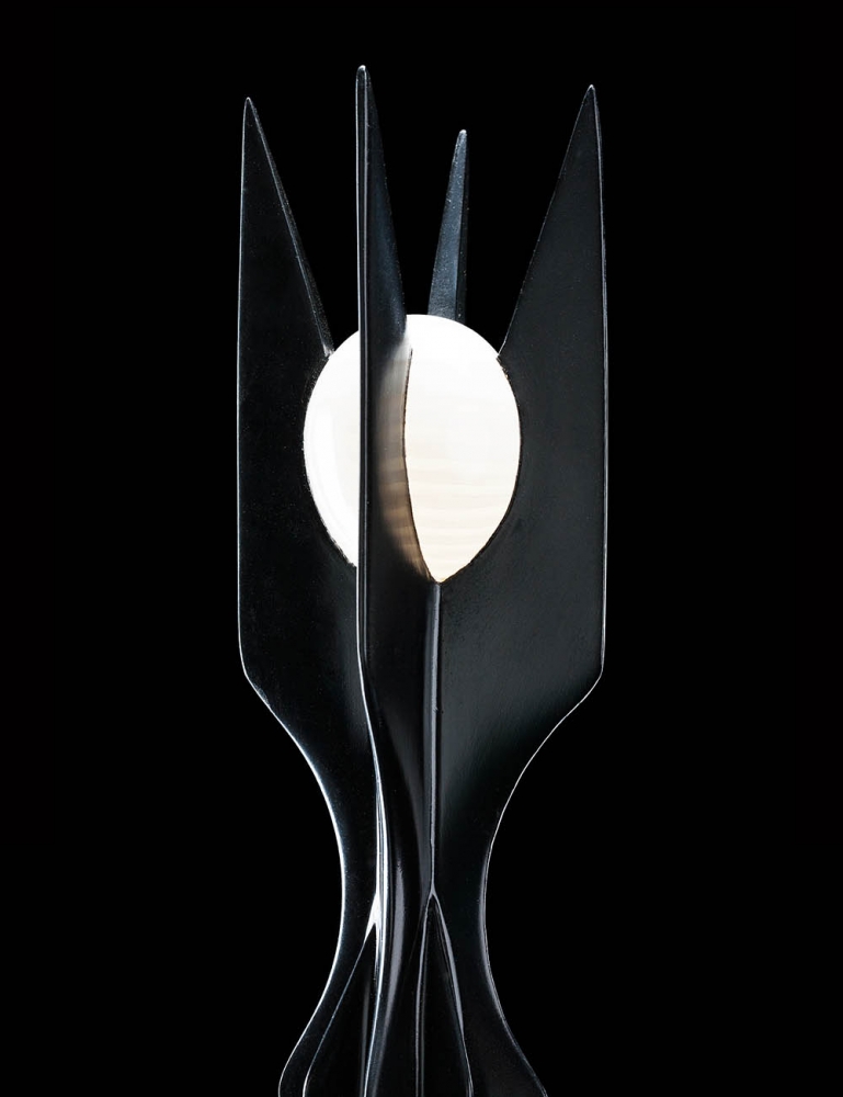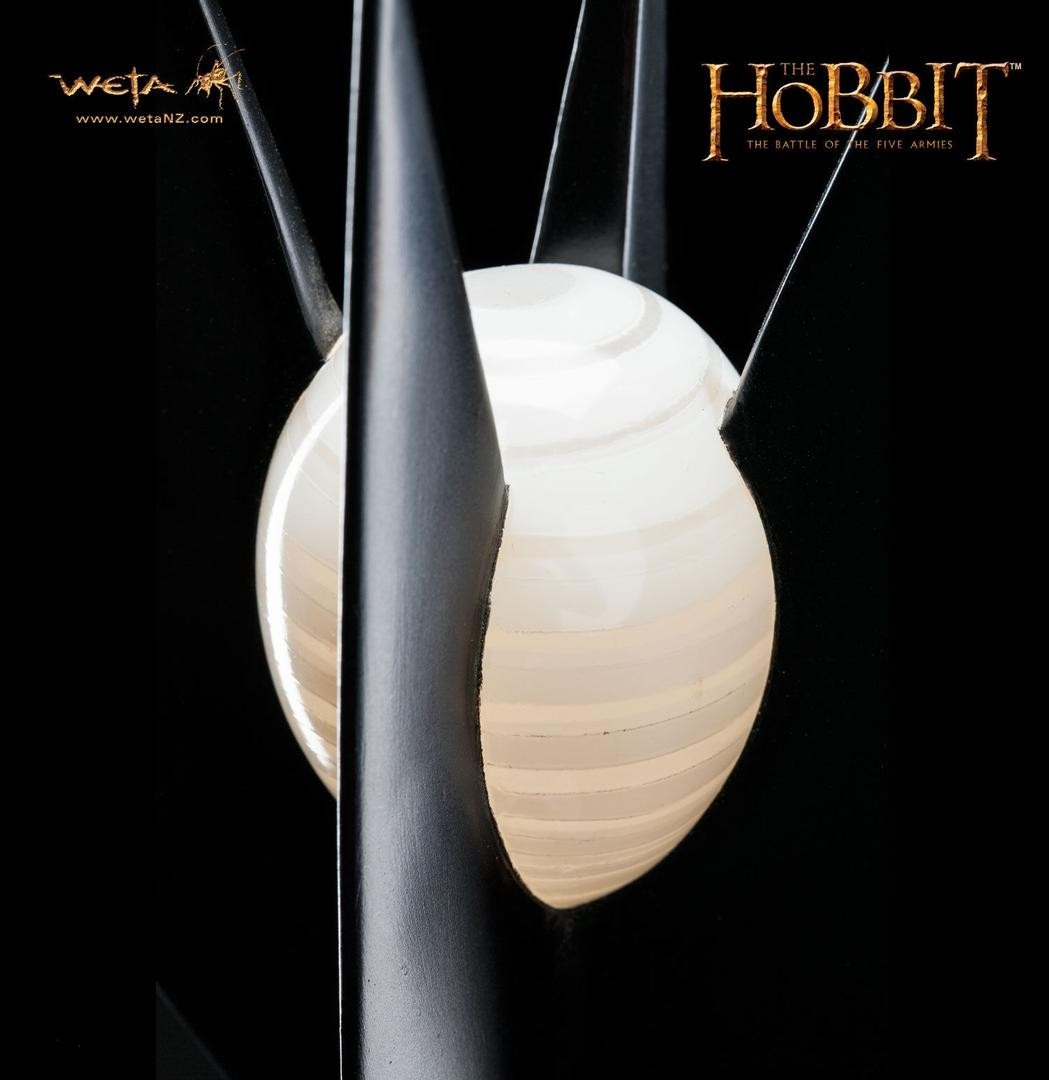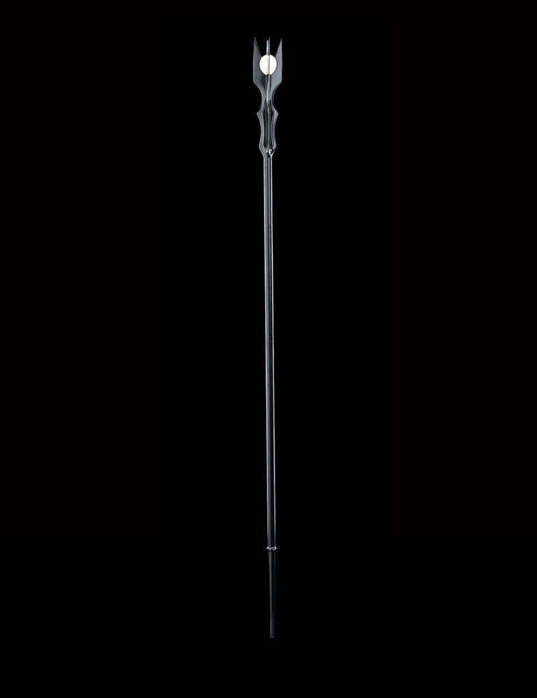 A rod of polished ebony as dark and gleaming as the midnight stone of the Tower of Orthanc itself, the staff of Saruman the White stands as tall, straight-backed and severe as its wielder. Sharp-edged and unyielding, in contrast to the twisted timber of his fellow Wizards’ staves, Saruman’s black staff holds a single orb of white stone amid four projecting fingers at its crown, recalling the four blades of Orthanc’s pinnacle, where the first of the Order of Istari dwells. Here he contemplates the mysteries of ring lore and prophecy, studying the ways of the enemy, the better to know him and his powers.