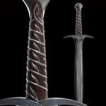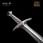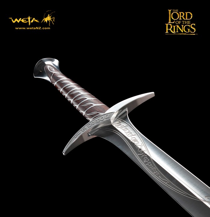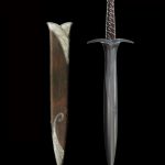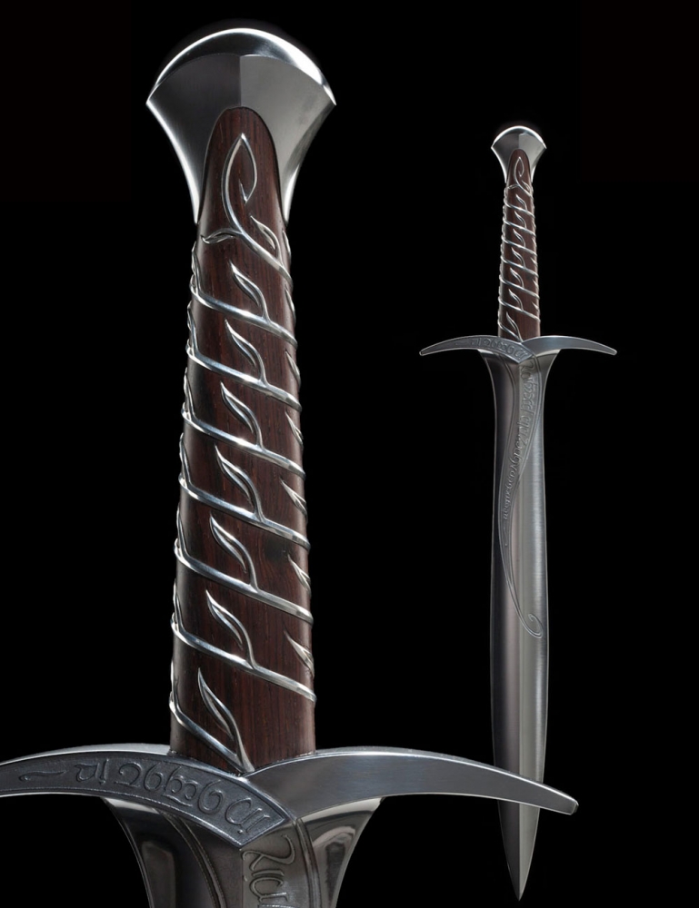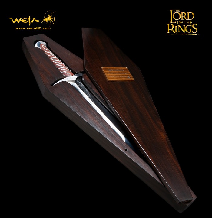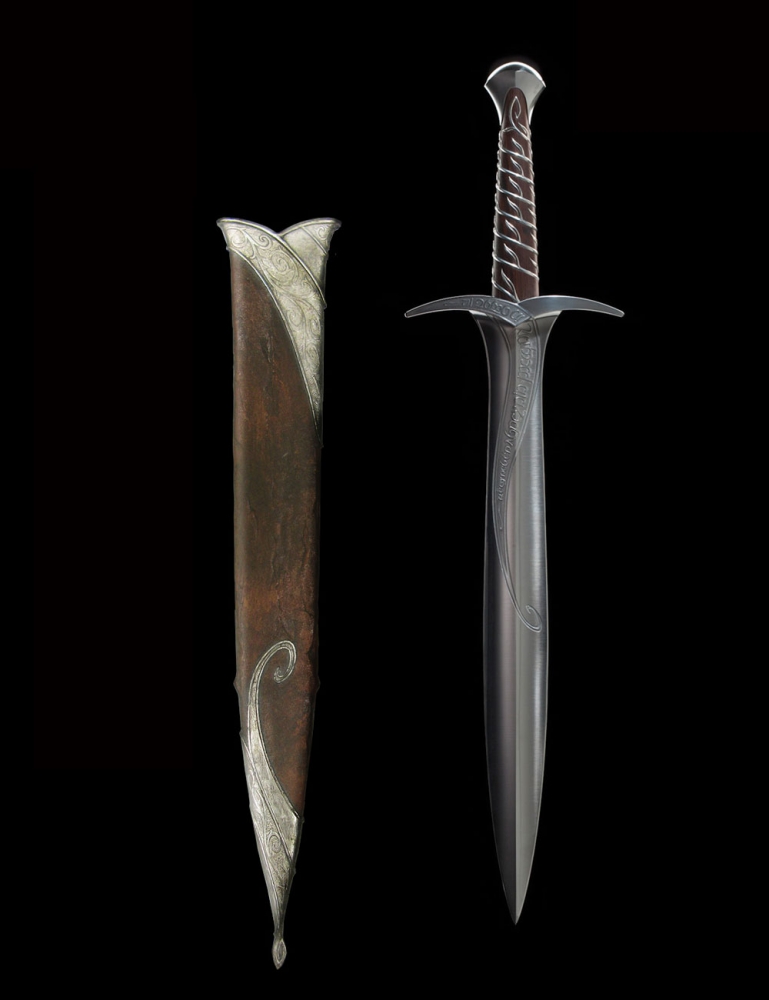 Found in a Trolls’ hoard by Bilbo Baggins, Sting was an ancient Elven blade from the lost realm of Gondolin. Bilbo carried it through many adventures, naming it and having it inscribed with Elvish script. Magical enchantments it held, glowing blue when Orcs were near. For long years Sting gathered dust in the old Hobbit’s cupboards until need arose to unsheathe its keen edge once more and he presented it to his young cousin Frodo Baggins in Rivendell. Frodo would carry it with him toward Mordor, and it would save his life more than once before the end. Sting was designed by Daniel Falconer and made at Weta Workshop in New Zealand for The Lord of the Rings film trilogy by Master Swordsmith Peter Lyon.