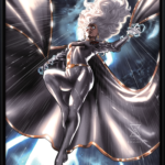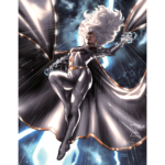 Ororo Munroe, better known as the mutant Storm, shines as brightly as a bolt of lightning in this stunning illustration that shows the fan-favorite X-Men heroine truly in her element. Rain pours from the heavens as Storm summons dark clouds above and electricity at her fingertips. Dressed in her classic ‘90s-era costume, she lives up to the title of goddess with radiance, strength, and the ferocity of a tempest, her eyes glowing while her hair and cape billow dramatically in the swirling winds.