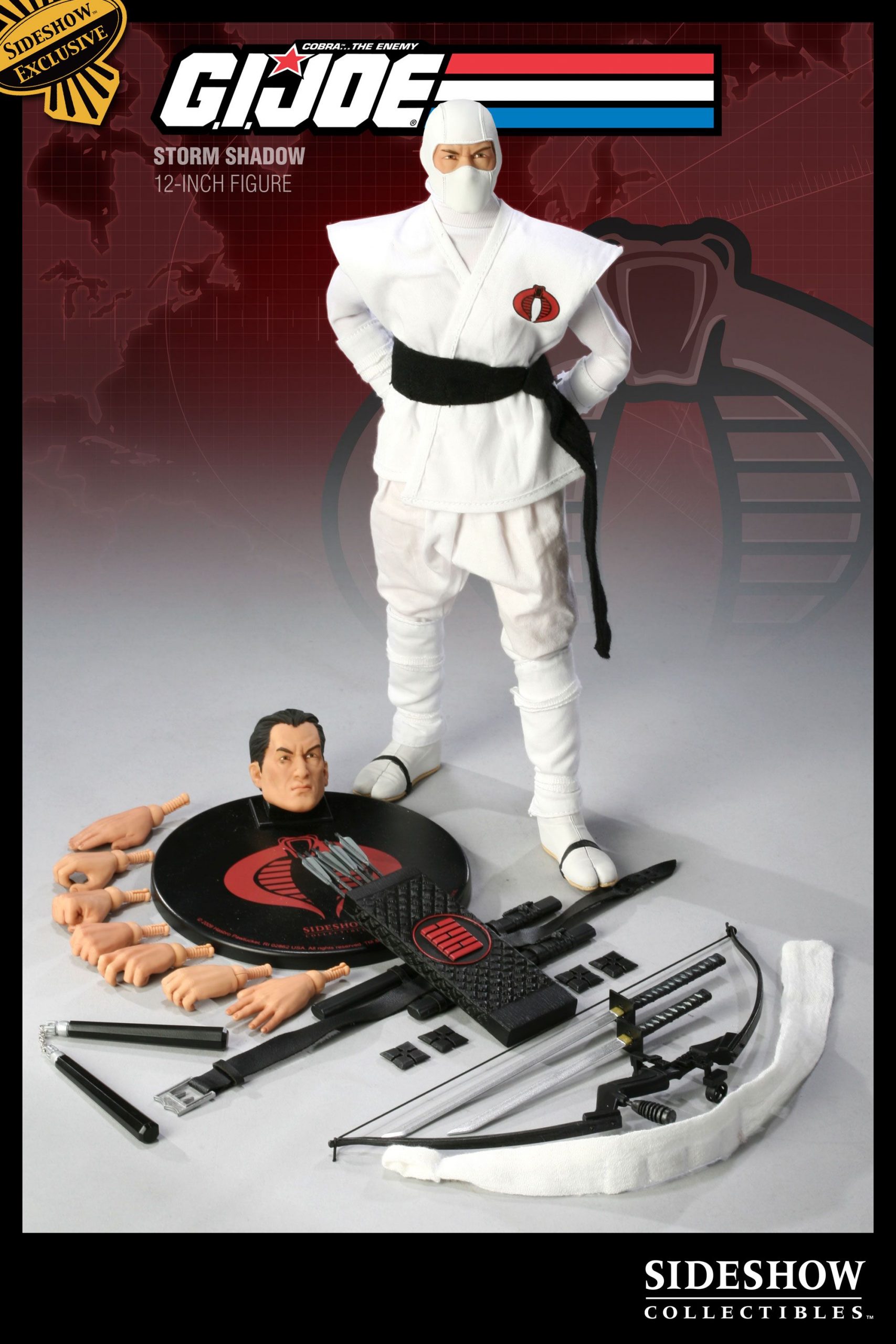 Storm Shadow masked portrait, Storm Shadow unmasked portrait, Undershirt, Vest, Pants, Boots, Sashes with pockets, Forearm Bracers, Leg wraps, Detailed belt, Quiver, Bow, Arrows, Ninja stars, Long sword with scabbard, Short sword with scabbard, Nine interchangeable hands
