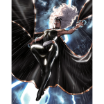 Ororo Munroe, better known as the mutant Storm, shines brighter than a bolt of lightning in this stunning illustration that shows the fan-favorite X-Men heroine truly in her element. Rain pours from the heavens as Storm summons dark clouds above and electricity at her fingertips. She is dressed in her iconic black and gold bodysuit, her billowing white hair adorned with a tiara denoting her title of goddess. Storm ignites the atmosphere with radiance, strength, and the ferocity of a tempest, representing the calm eye at the center of the chaos.