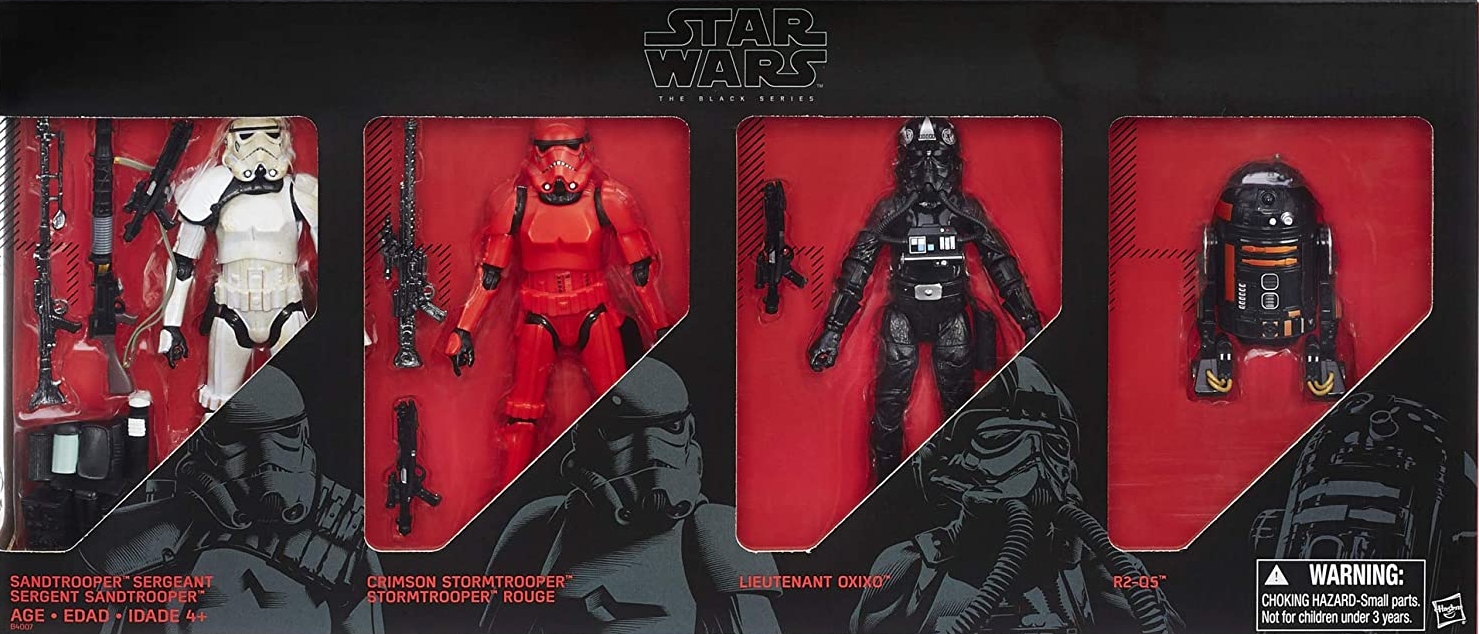 This set includes Crimson Stormtrooper, Sandtrooper Sergeant, TIE pilot Lt. Oxixo, and black droid R2-Q5.