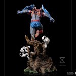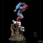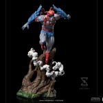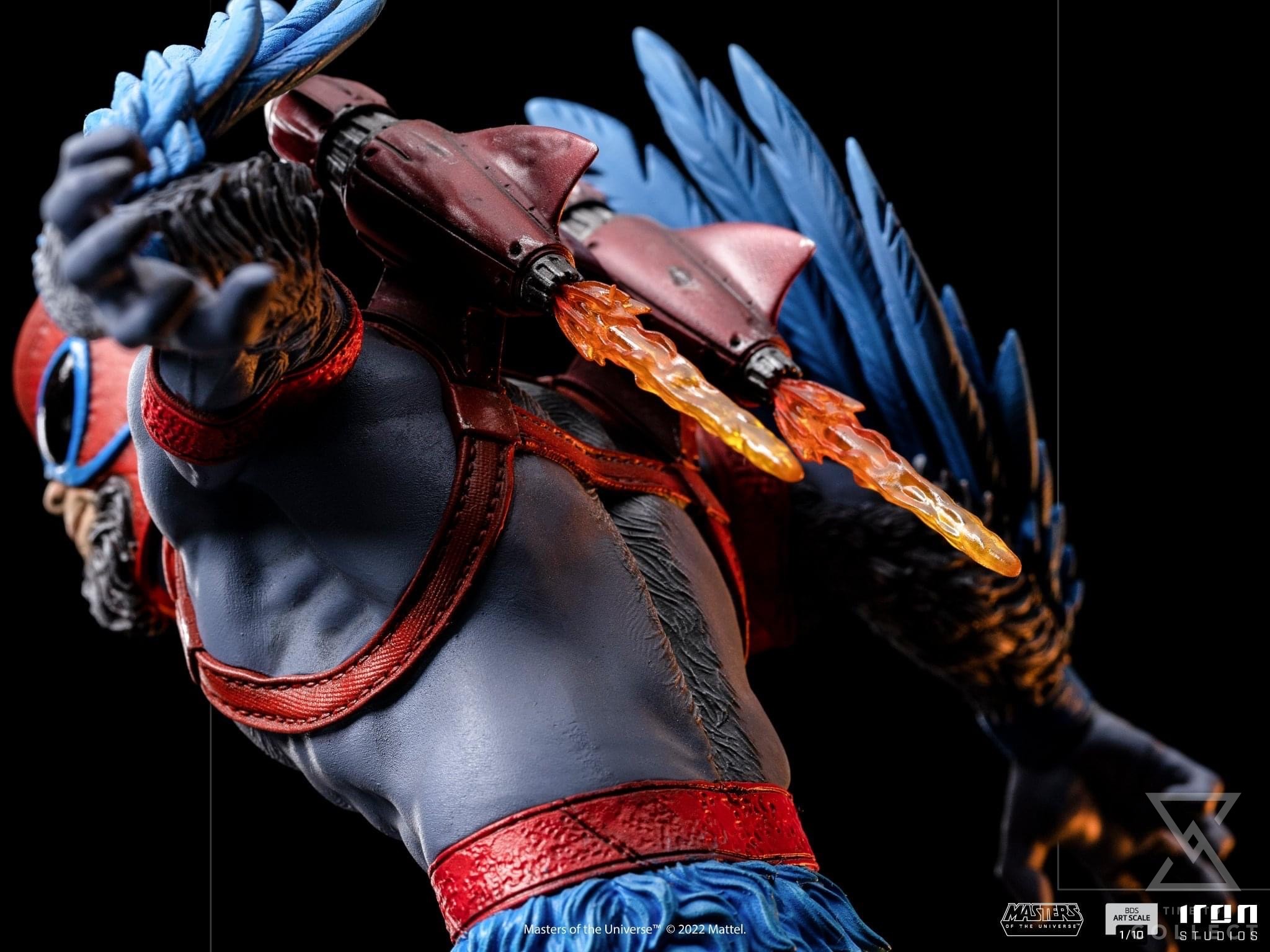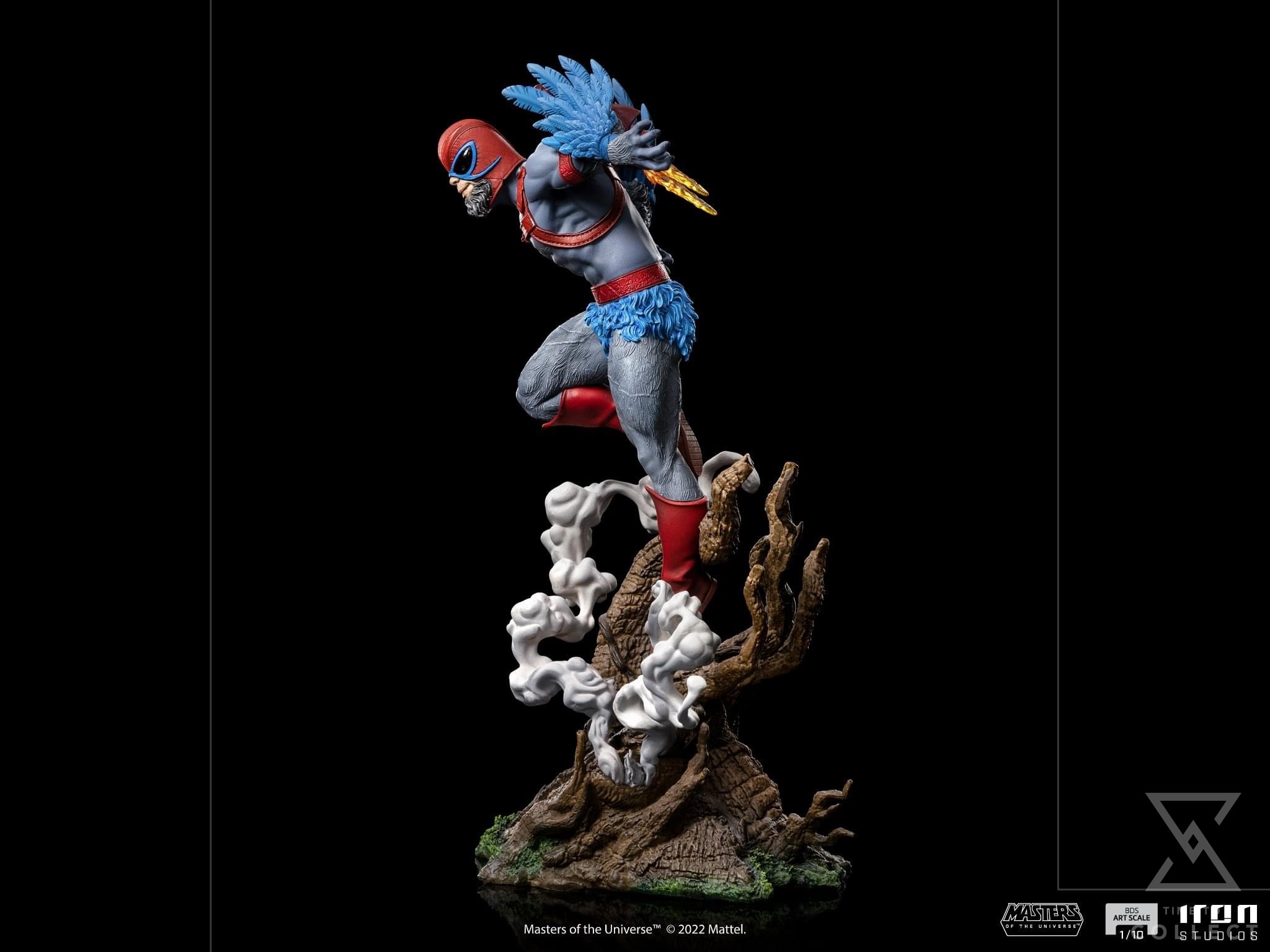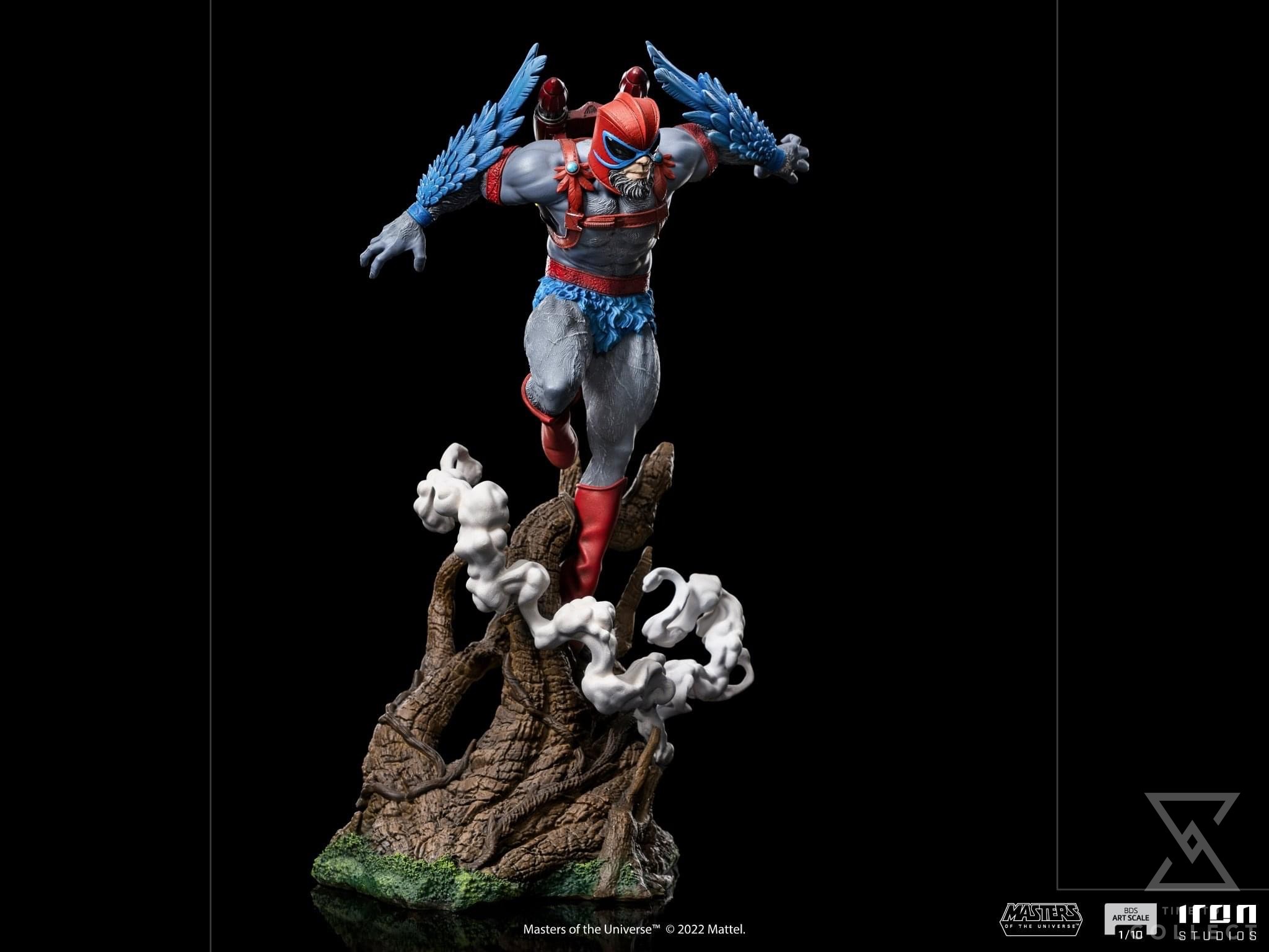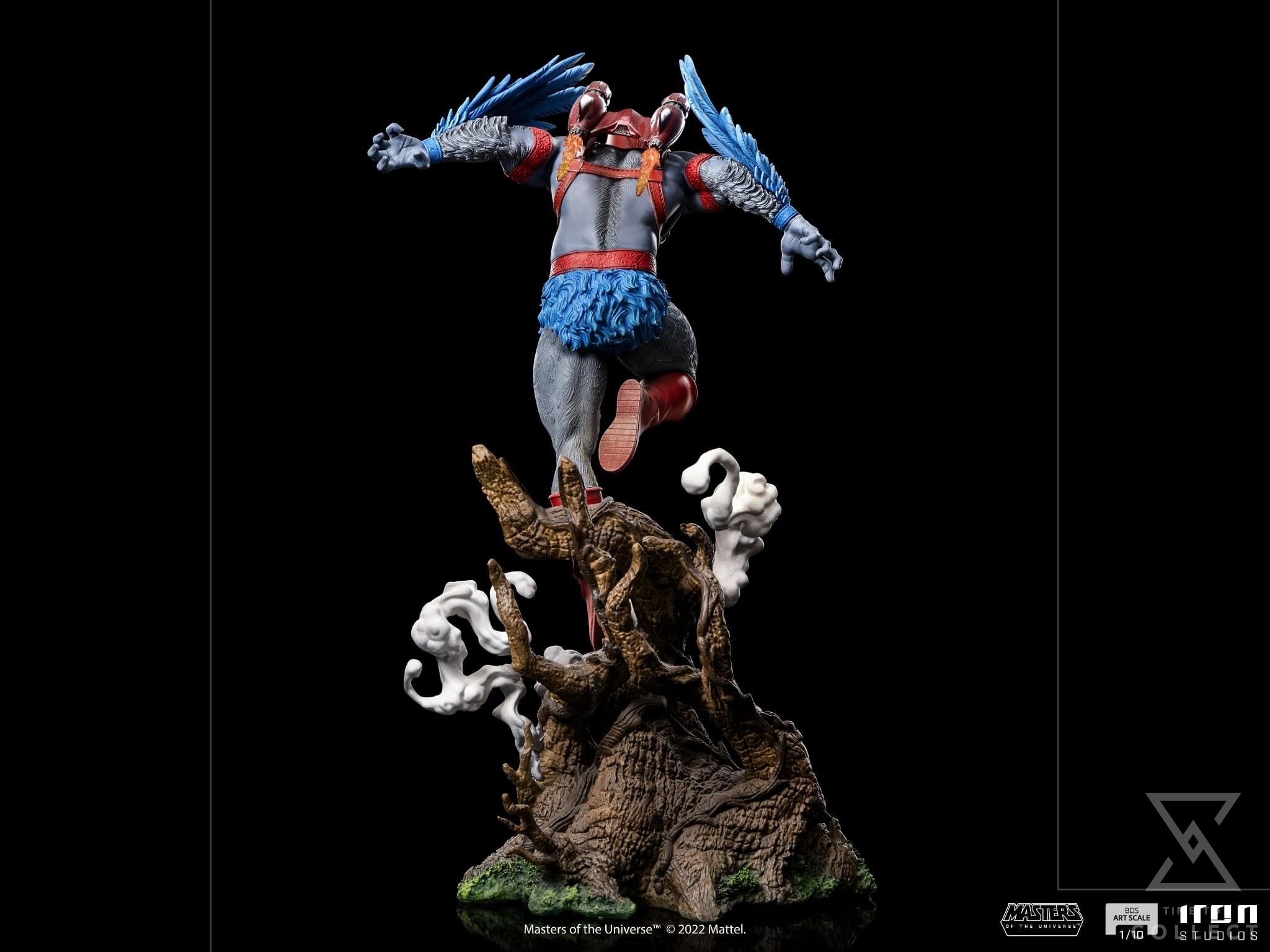 From the top of the peaks of the Mystic Mountains, between trunks and ramifications of the local vegetation, cut by the ivory and white mist from the high-altitude clouds, the noble and heroic winged warrior takes flight, confident and powerful in his natural habitat, his bravery, leadership, and aerial acrobatics skills make him one of the most valuable allies of the Masters of the Universe in their fight against the evil forces led by the sorcerer Skeletor, the lord of the Snake Mountain, and his minions. Bringing a jetpack on his back to enhance his flight speed, and with his sharpen eyes like a bird of prey, besides a great fighter he acts like a sneaky spy to the heroic warriors, defenders of planet Eternia. Expanding their MOTU collection, Iron Studios present the statue “Stratos BDS Art Scale 1/10 – Masters of the Universe – Art Scale 1/10”, with Avion’s monarch and ally of He-Man.
