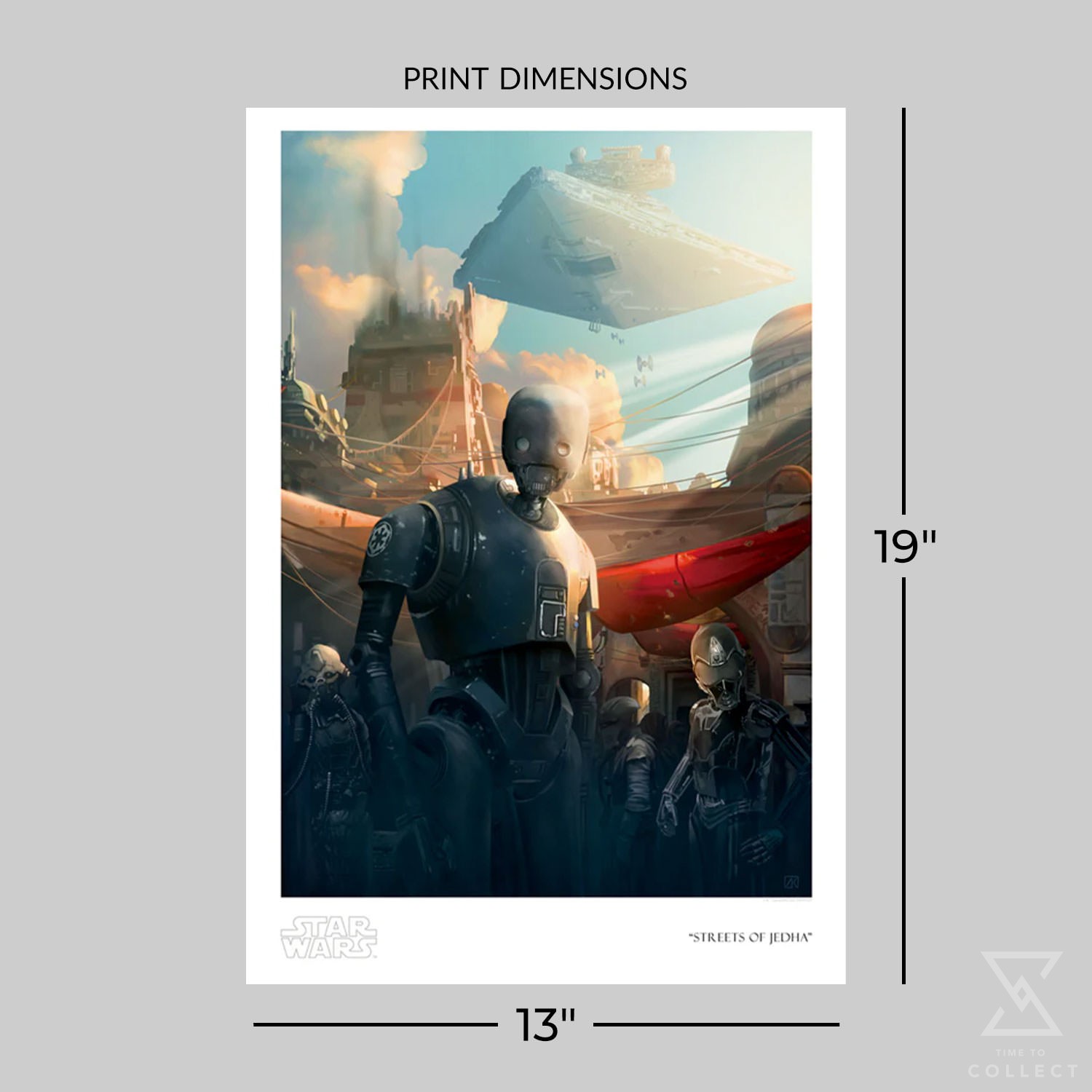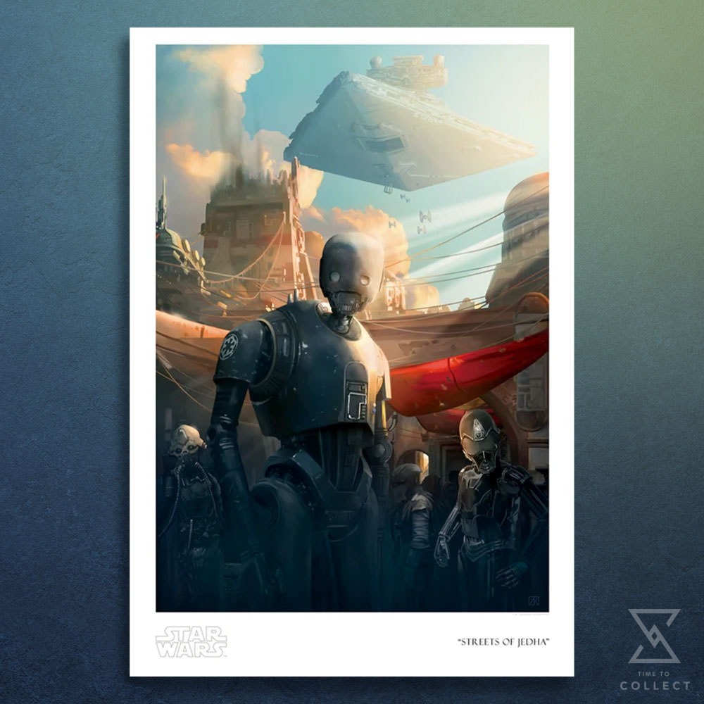 K-2SO arrives to help clear the hostiles in Jedha city in this incredible Star Wars artwork inspired by Rogue One: A Star Wars Story. Each fine art giclee print is hand-numbered from a limited edition of 150 pieces and comes with a Certificate of Authenticity.