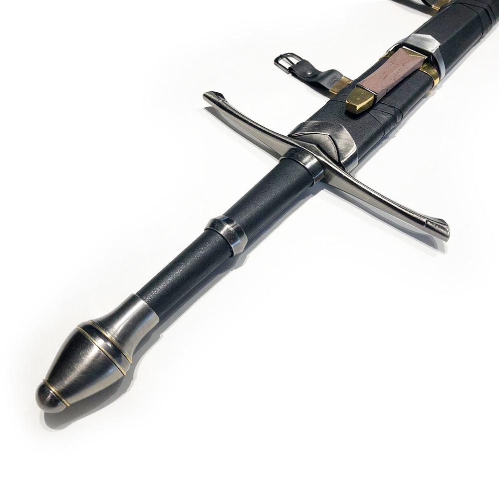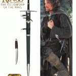 This authentically detailed scabbard is a reproduction of the prop prominently featured in “The Lord of the Rings” film trilogy, presented by New Line Cinema. United® Cutlery Brands, industry leader in fine movie knife and sword reproductions, has meticulously recreated the actual prop scabbards, using the finest grade materials and craftsmanship of the highest quality available. Features include genuine leather wrap and straps, solid metal collar, fittings, buckles, and tip with antiqued metal and brass finishes. Includes a companion hunting knife, which is housed in its sheath on the side of the scabbard. Knife features include a stainless steel blade and pommel, wood handgrip, and brass bolster. Strider used the knife to cut leaves from the Kingsfoil plant in “The fellowship of the Ring,” He then used the leaves to help heal the wound Frodo received from the Witch King.