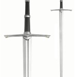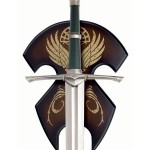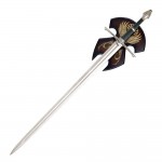 The blade is 91.5 cm long, unsharpened and made of 420 J2 stainless steel with a false-edge. The handle has a genuine leather-wrapped grip, solid metal cross guard and pommel, antique metal finish, rat-tail tang construction. Each sword includes a decorative wooden display plaque that is silk screened with the heraldic insignia of the Kingdom of Gondor.