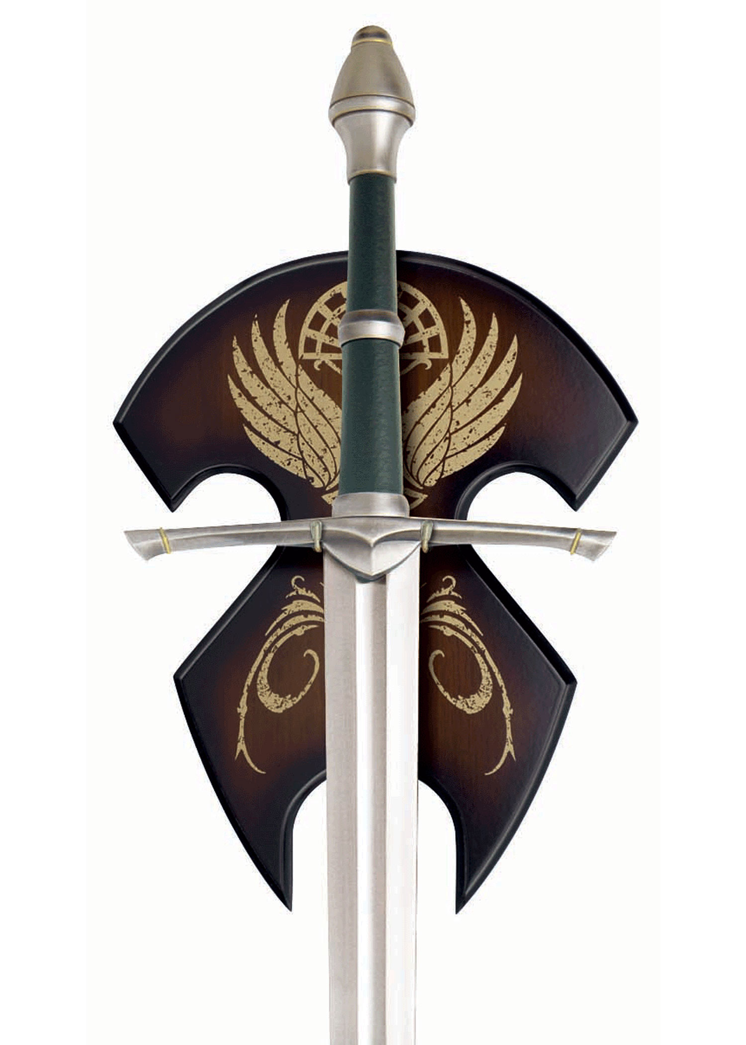 The blade is 91.5 cm long, unsharpened and made of 420 J2 stainless steel with a false-edge. The handle has a genuine leather-wrapped grip, solid metal cross guard and pommel, antique metal finish, rat-tail tang construction. Each sword includes a decorative wooden display plaque that is silk screened with the heraldic insignia of the Kingdom of Gondor.