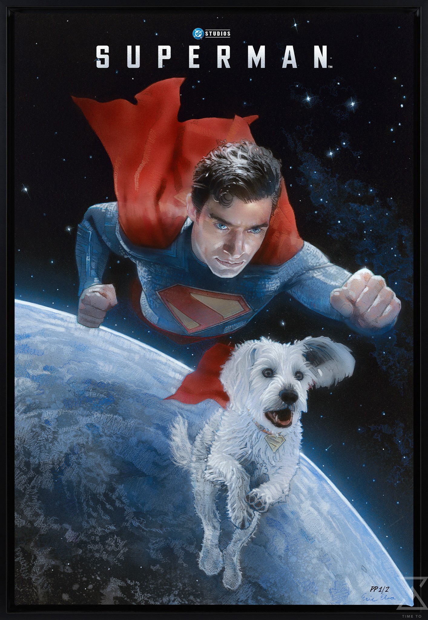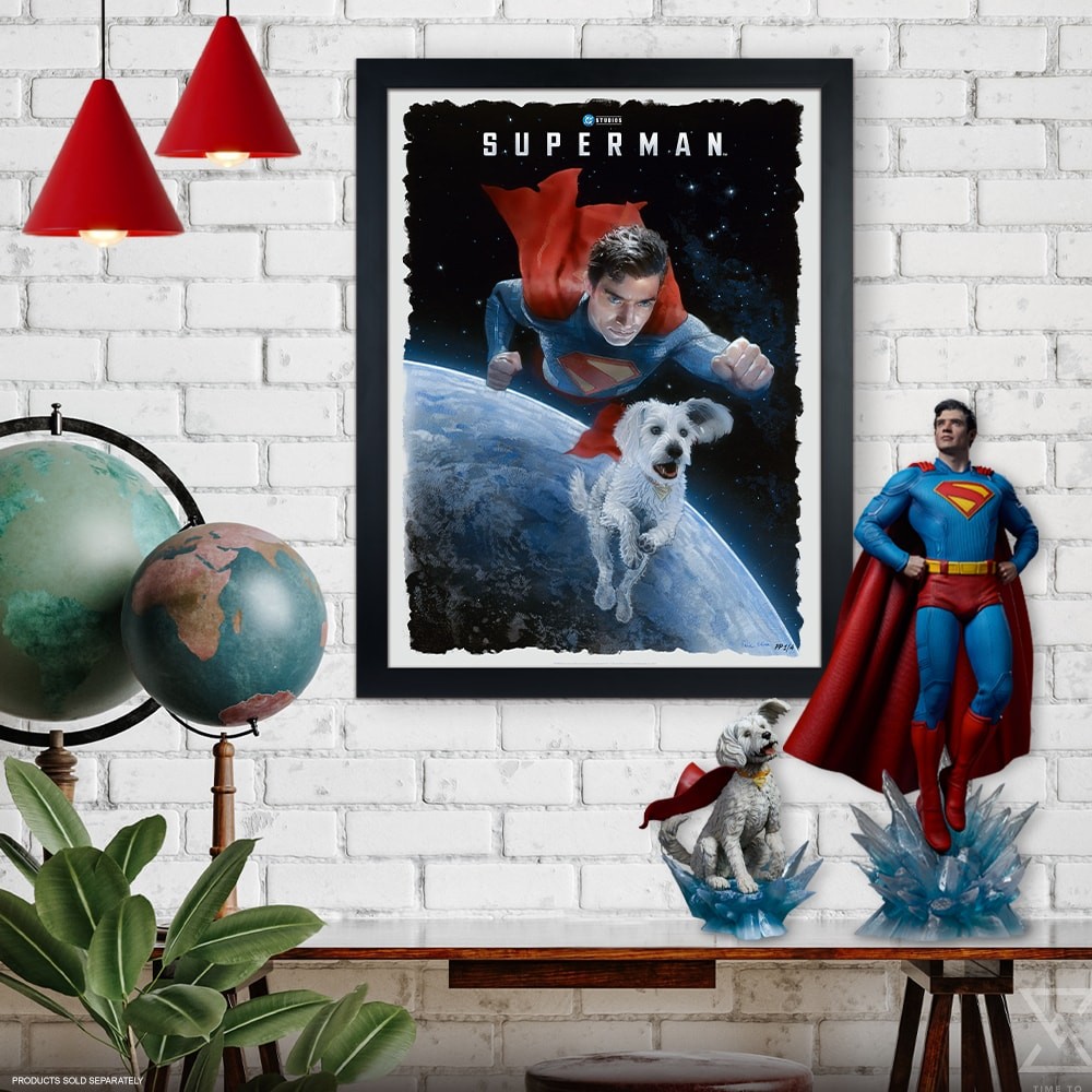 Released in celebration of Superman Day, this original concept movie poster is now available to fans as an unframed giclée print or in a custom framed presentation. Each Superman and Krypto Fine Art Print features an embossed Sideshow Seal of Authenticity as part of the limited edition of 200 pieces.