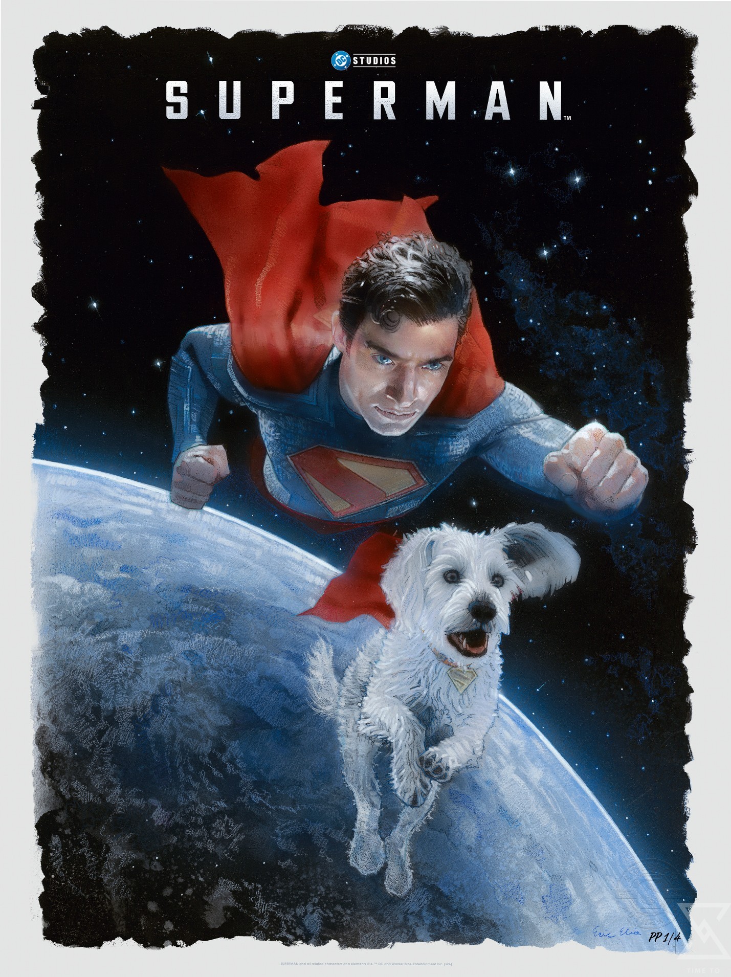 A superpowered puppy and his foster dad fly through space in this adventurous illustration inspired by Superman (2025) directed by James Gunn. Finding a surprisingly serene moment among the stars, Clark Kent and Krypto soar together in a show of companionship and mutual care. After all, best friends are furever.