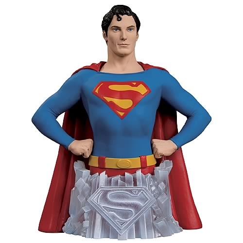 In honor of DC Comics’ 75th anniversary, Christopher Reeve’s quintessential portrayal of Superman is presented in bust form. Striking an iconic hands-on-hips stance, the Man of Steel is posed atop a crystal-like base that’s reminiscent of the Fortress of Solitude. This Superman Christopher Reeve Bust is hand painted, cold cast in porcelain, and measures approximately 5 3/4-inches tall x 5-inches wide x 3 1/4-inches long. It’s packaged in a 4-color box. Order yours today! Limited edition of 2,500 pieces.