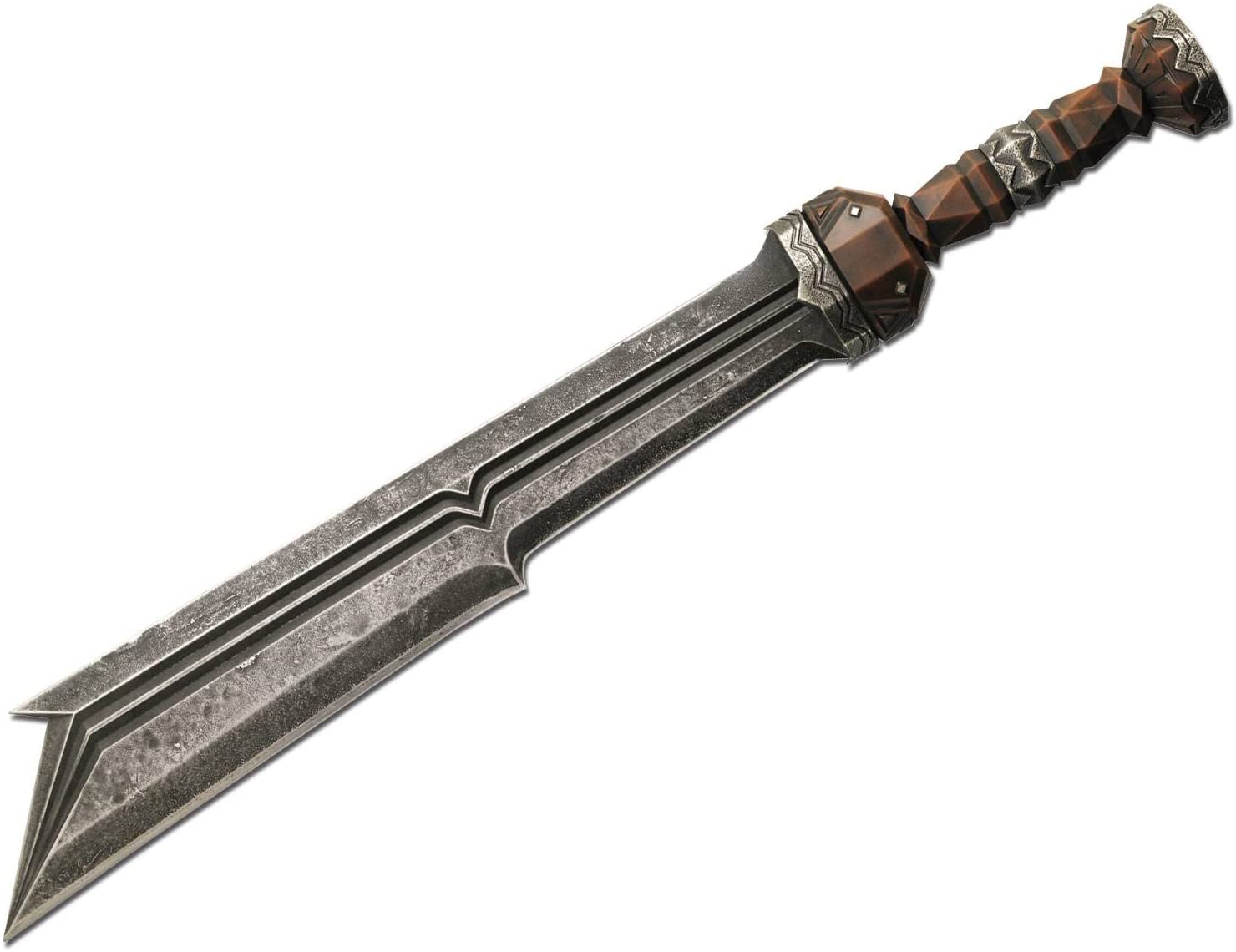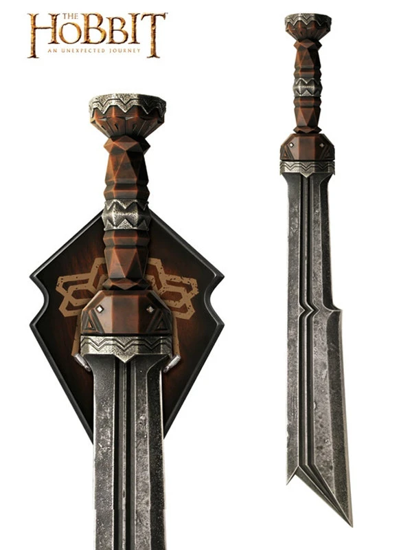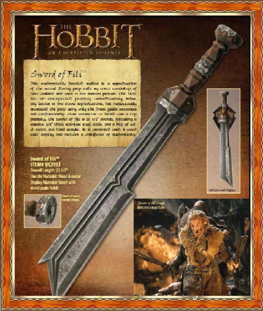 This authentically detailed replica is a reproduction of the actual filming prop built by Weta Workshop of New Zealand and used in the motion picture, THE HOBBIT: AN UNEXPECTED JOURNEY. United Cutlery, industry leader in fine movie reproductions, has meticulously recreated the prop using only the finest grade materials and craftsmanship. Close attention to detail was a top priority. The Sword of Fili is 25 1/2”(65.2cm) overall, featuring a massive 3/8″ thick stainless steel blade, and a hilt of solid metal and hard acrylic. It is presented with a wood wall display and includes a certificate of authenticity.