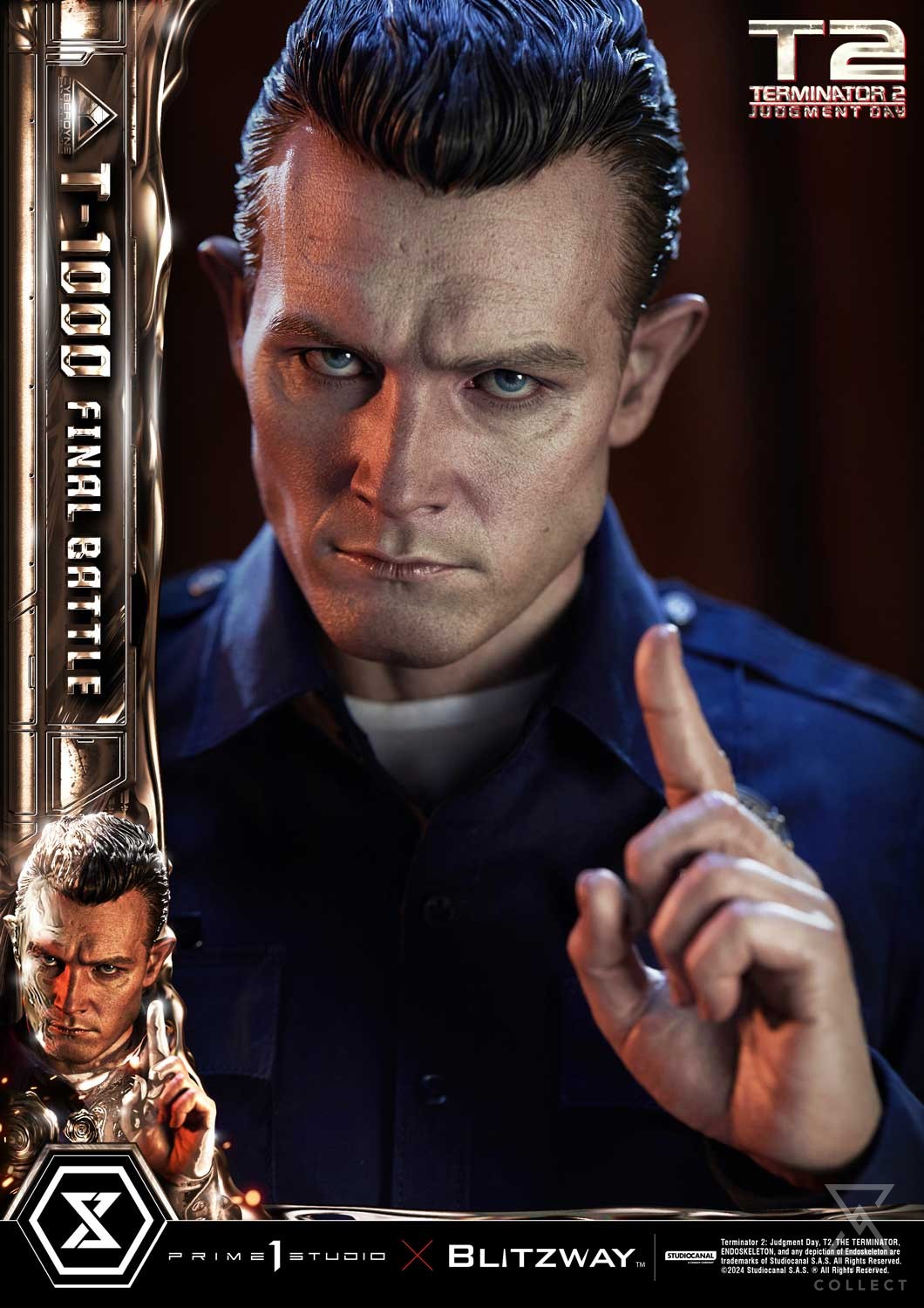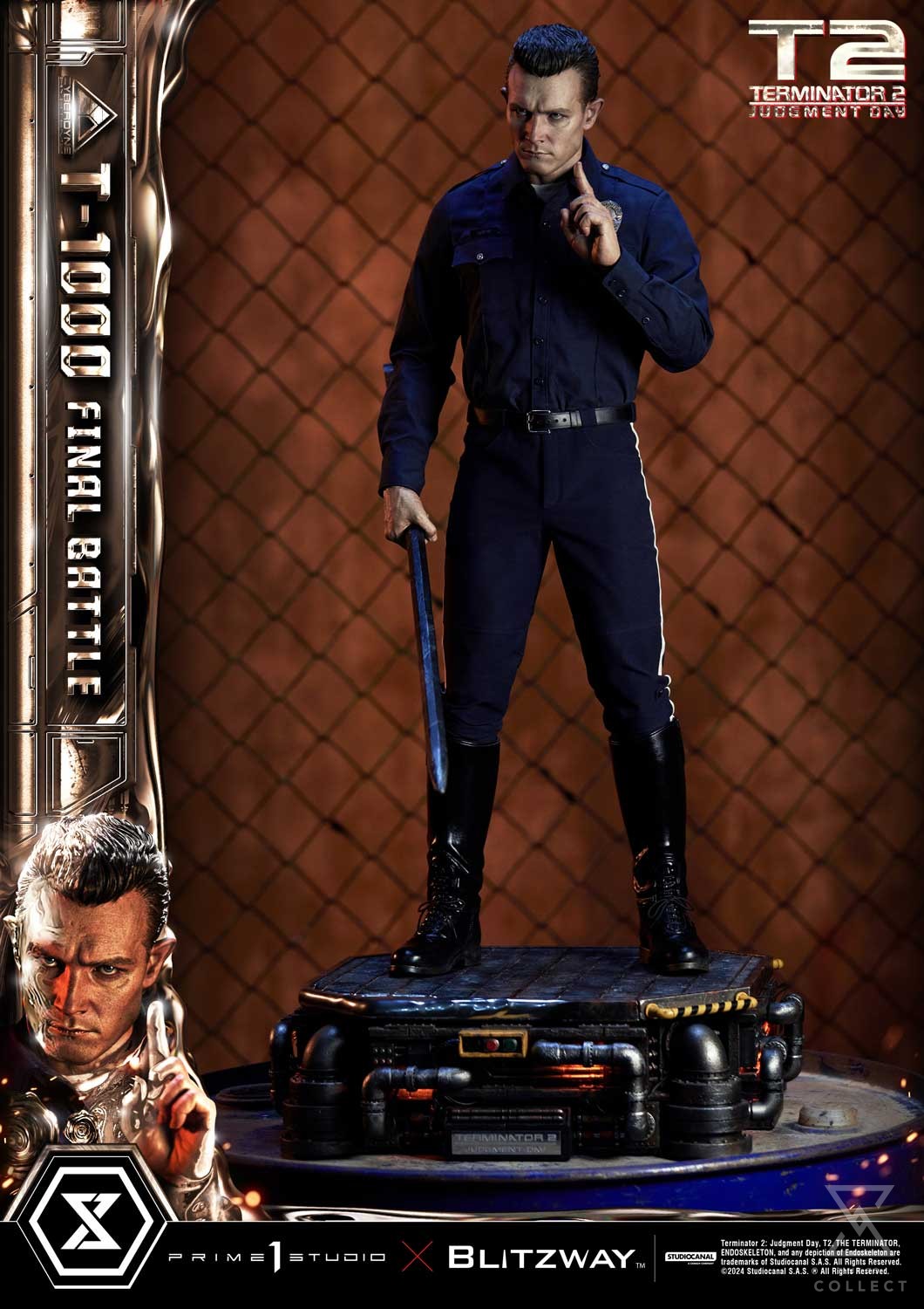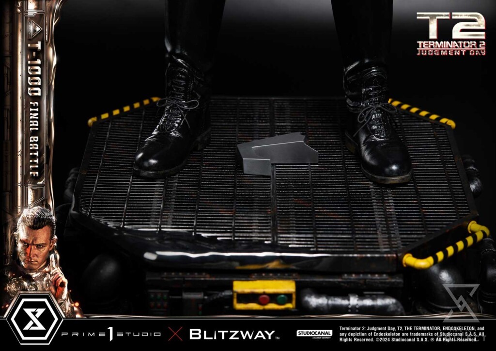 This time, we are taking you back to the climax of the movie, the final battle between the T-800 and T-1000 at the steel mill, bringing you a hyper-realistic screen-accurate depiction of the T-1000. As usual, Blitzway masterfully sculpted this 28.6-inch-tall work of art. Upon its arrival, the T-1000 killed Officer Joe Austin and mimicked his appearance and clothing, and in a similar manner, our artists have done a breathtaking job at replicating the T-1000’s body in this beautiful statue, capturing the intense and stern expression! You could almost see the finger-wagging as he shakes his head in rejection after being shot, as we may have seen, this new prototype is made of liquid metal and takes little to no damage as it can regenerate almost instantly. Resistance is futile! The police uniform, made of real fabric, is meticulously crafted with the greatest attention to detail, from the buttons to the belt and the boot laces. Two swappable right hands are included should you want to display a free hand or one holding a metal rod. T-1000 Final Battle stands atop a steel-factory-themed base that is LED illuminated, a Claw Hook at his feet. To say that this absolute work of art is a must-have for any Terminator fans is an understatement. This highly detailed likeness sculpture of Robert Patrick’s’ T-1000 is sure to make a statement in any collection. Pre-order the MMT2-03 T-1000 Final Battle while quantities last!