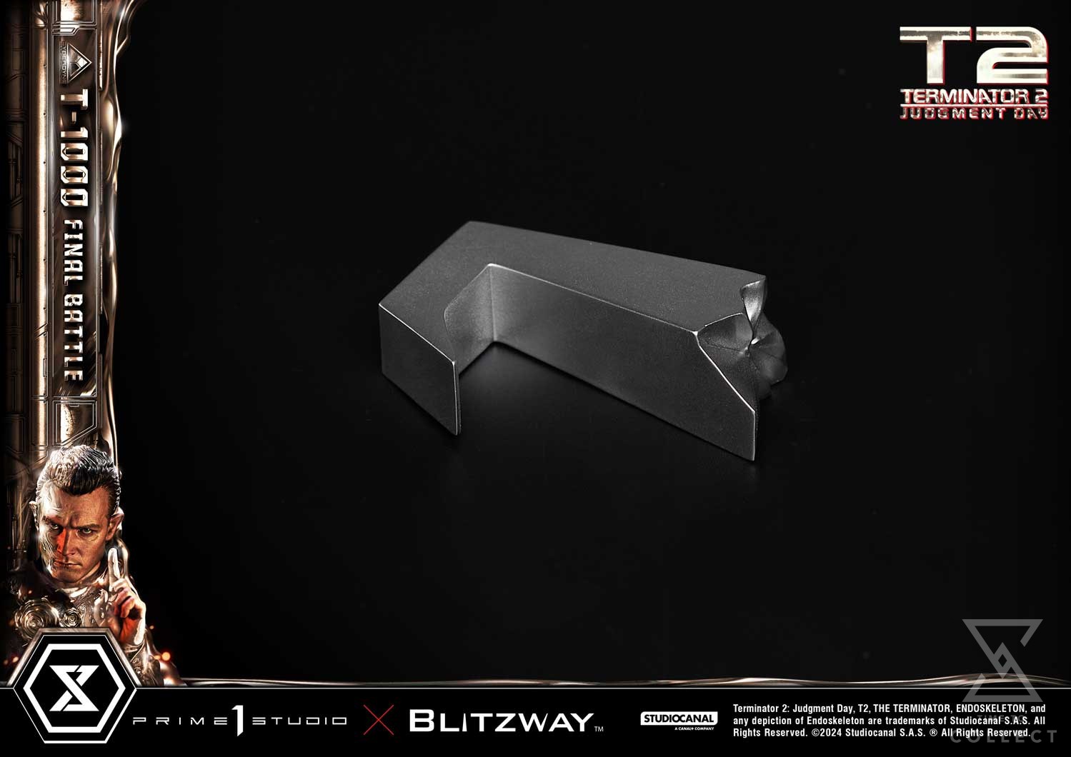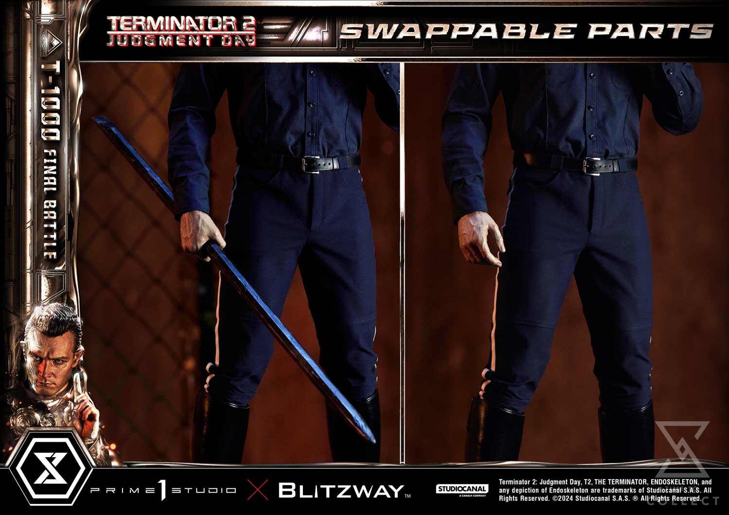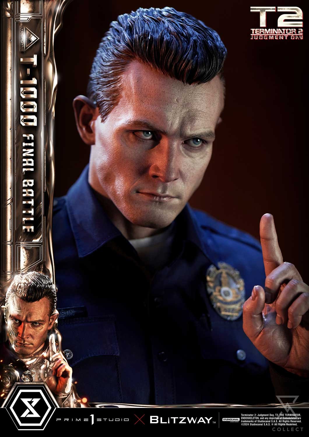 This time, we are taking you back to the climax of the movie, the final battle between the T-800 and T-1000 at the steel mill, bringing you a hyper-realistic screen-accurate depiction of the T-1000. As usual, Blitzway masterfully sculpted this 28.6-inch-tall work of art. Upon its arrival, the T-1000 killed Officer Joe Austin and mimicked his appearance and clothing, and in a similar manner, our artists have done a breathtaking job at replicating the T-1000’s body in this beautiful statue, capturing the intense and stern expression! You could almost see the finger-wagging as he shakes his head in rejection after being shot, as we may have seen, this new prototype is made of liquid metal and takes little to no damage as it can regenerate almost instantly. Resistance is futile! The police uniform, made of real fabric, is meticulously crafted with the greatest attention to detail, from the buttons to the belt and the boot laces. Two swappable right hands are included should you want to display a free hand or one holding a metal rod. T-1000 Final Battle stands atop a steel-factory-themed base that is LED illuminated, a Claw Hook at his feet. To say that this absolute work of art is a must-have for any Terminator fans is an understatement. This highly detailed likeness sculpture of Robert Patrick’s’ T-1000 is sure to make a statement in any collection. Pre-order the MMT2-03 T-1000 Final Battle while quantities last!