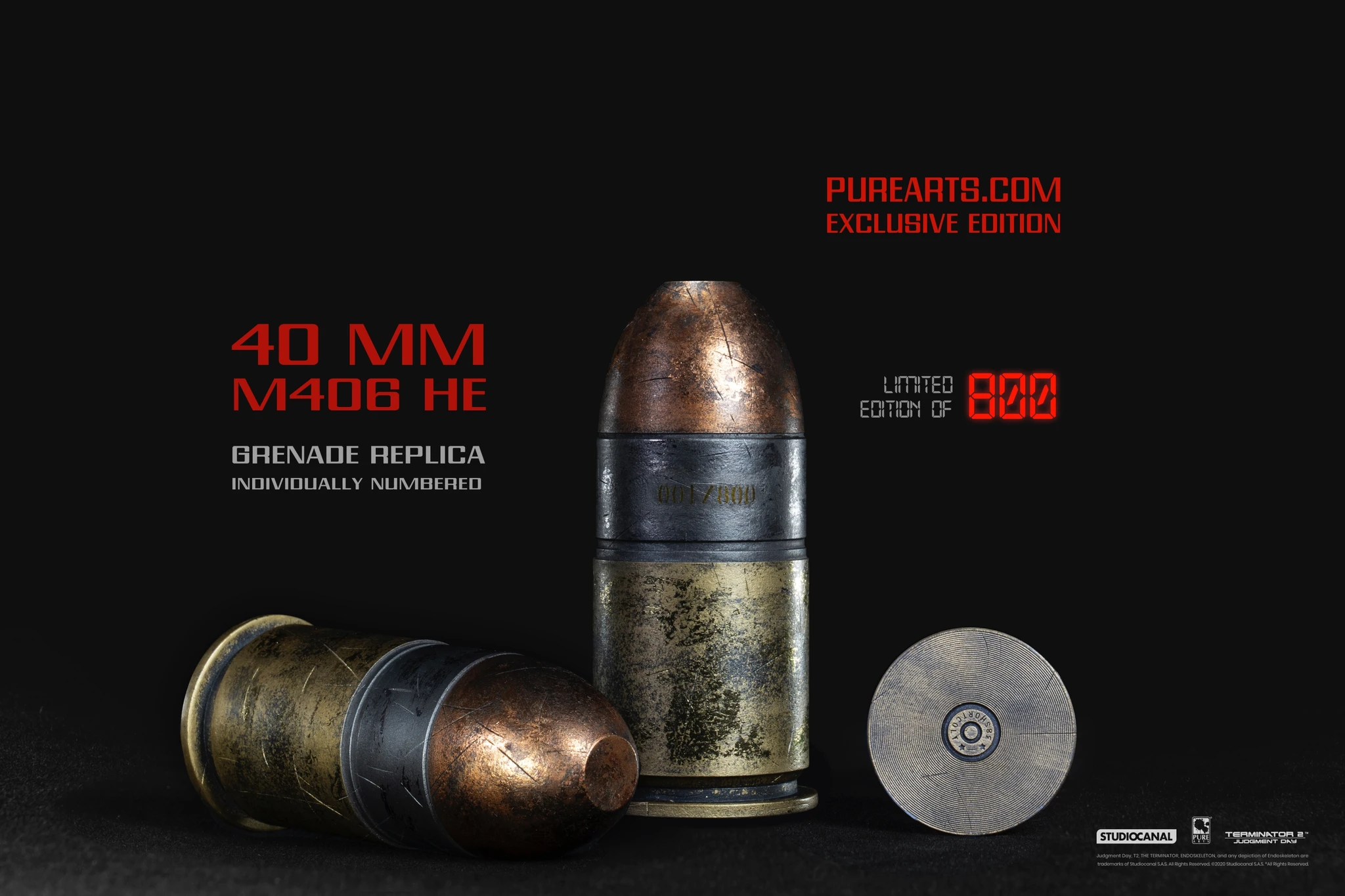 Limited to 800 units, the PureArts.com Exclusive Edition includes a screen-accurate prop replica of the 40mm M406 HE grenade round, used extensively with the M79 grenade launcher in Terminator 2 by the T-800. Each grenade is individually numbered – explosions not included.