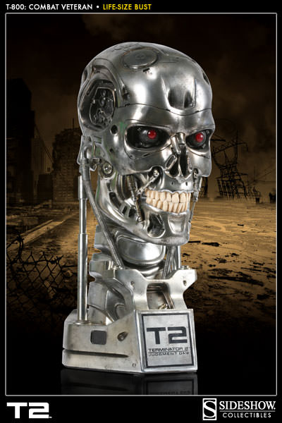 Celebrating the modern classic, Terminator 2: Judgment Day, Sideshow Collectibles and Stan Winston Studios partnered to create the T-800 Endoskeleton Life-Size Bust. This film-accurate Endoskeleton skull has been reproduced with stunning attention to detail and authenticity, crafted by the same artists that created the Endoskeleton for T2. The metallic finish is combat weathered from battle and we’ve finished our series 800 Terminator with electronic light-up eyes and a removable CPU microchip, bringing this must-have movie icon to life for your collection.