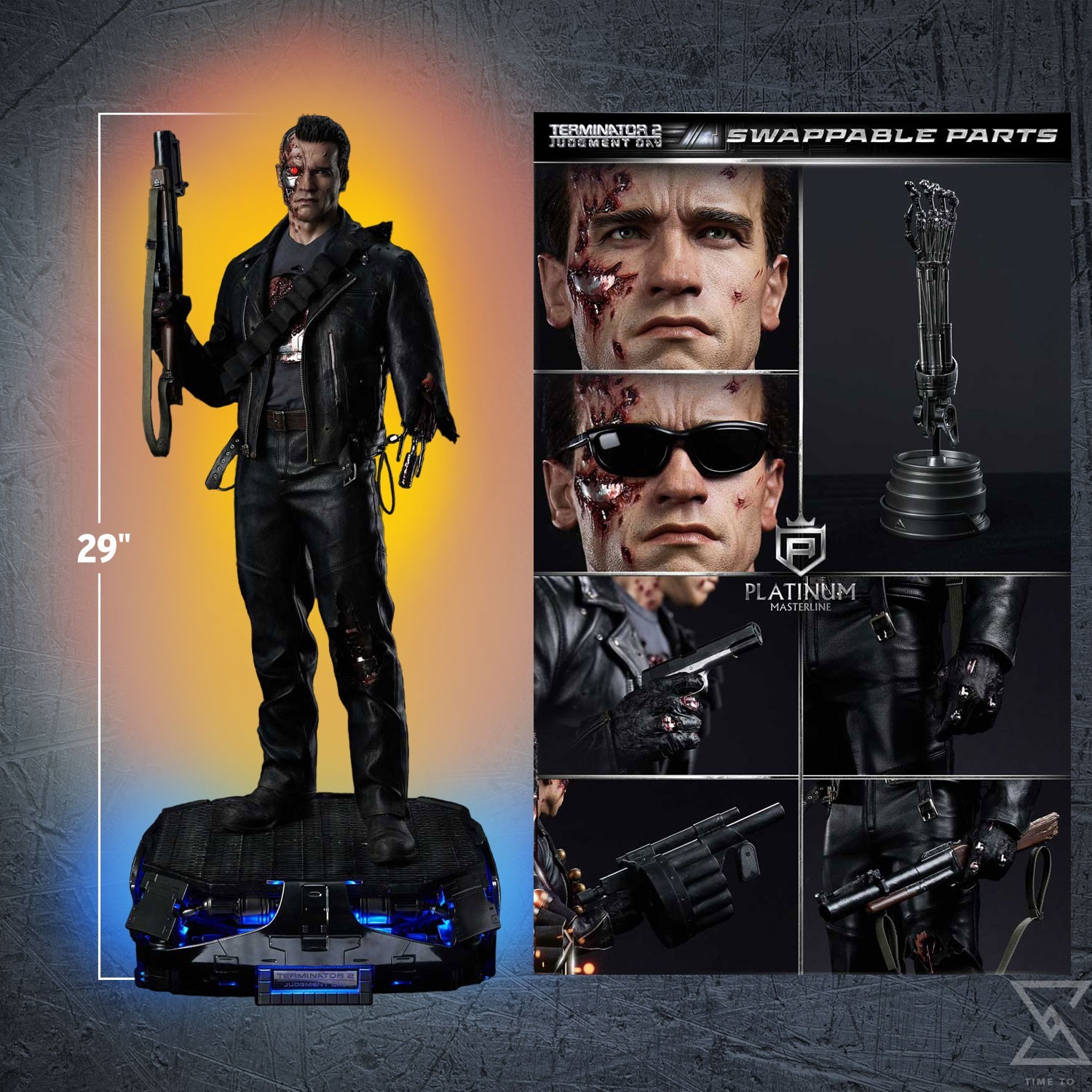 The Platinum Masterline pushes boundaries even further by using high-quality materials for the statues. Rooted hair and glassed eyes are used for a mesmerizing, hyper-real life-like face. We’ve included a pair of sunglasses should you want to cover those beautiful eyes. Genuine black leather has been used to recreate the Terminator’s outfit with masterful attention to detail. We are talking bullet holes, scratches and tears, zippers, pockets, and buckles on the stunning biker jacket, accessorized with a textile cartridge belt. The torn pant-leg shows a glimpse of the exposed endo-leg underneath. Two right-hand parts allow you to display either the impressive Hawk Engineering MM1 tear gas launcher or handgun. The gloved left hand can also be swapped for another that is holding a grenade launcher or for an Endo arm that can also be displayed separately on its base display. The Cyberdyne Systems cyborg stands atop a steel-factory-themed base that is also LED-illuminated. At his feet is a chain hoist hook, a small nod to his noble sacrifice that still wrenches our hearts.