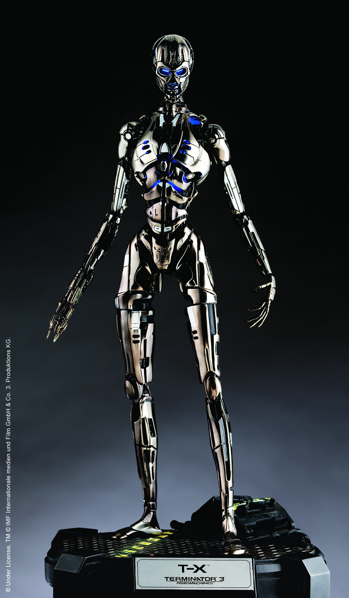 - Blue LED lights incorporated throughout the body to simulate the T-X’s glow.