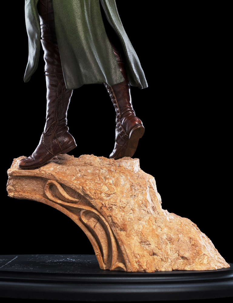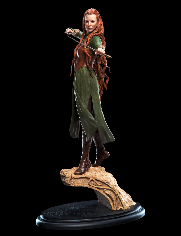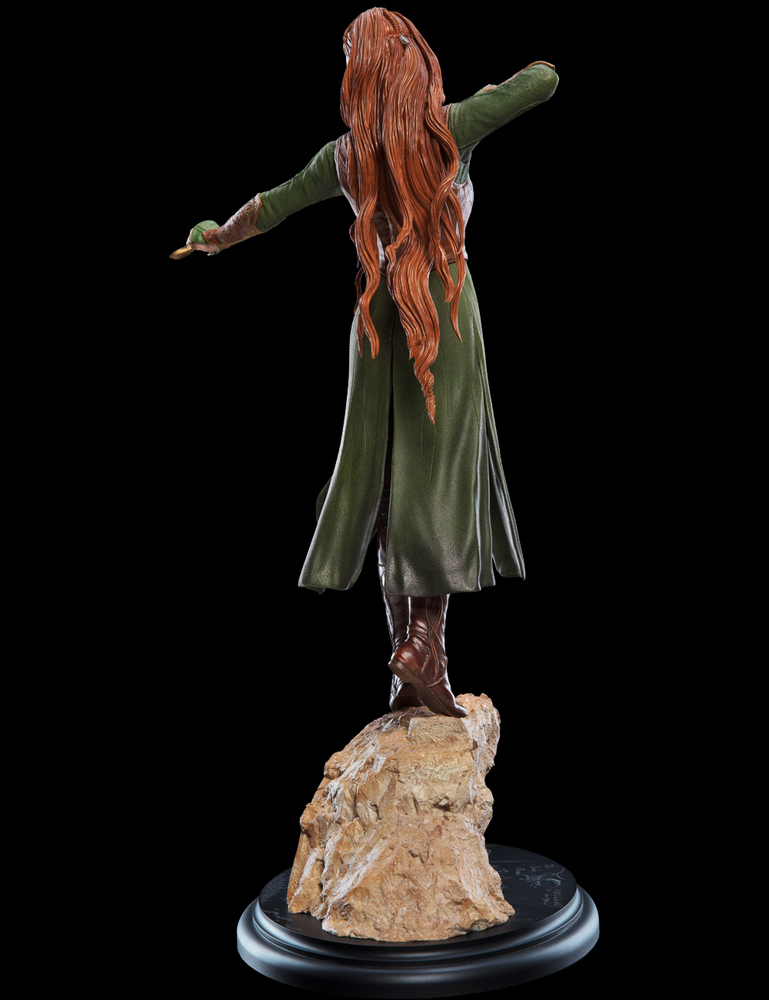 For wardrobe, costume designer Lesley Burkes Harding created a sense of continuity with Arwen’s riding outfit in The Lord of the Rings. Rather than Elven silks beneath the travelling cloak, Tauriel wore a deerskin jacket and leather cuirass befitting the Captain of Thranduil’s Guard. The leather armour was constructed by Weta Workshop’s Cathy ‘Tree’ Harris, with leaf detailing by Kelly Marie and Daniel Falconer. Capturing all this fine detail, from dual daggers to decorated armour, was sculptor Gary Hunt – no stranger to Middle-earth, having worked on both The Lord of the Rings and The Hobbit trilogies. Using the original screen-used daggers and costume as reference, Gary worked digitally in Zbrush to bring Tauriel to life.