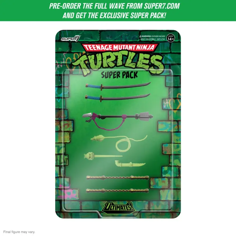 Assemble the complete Teenage Mutant Ninja Turtles ULTIMATES! Wave 11 collection and receive an exclusive Super Pack with an assortment of weapons specific to these characters! Available only with the purchase of the full wave of Super7 ULTIMATES! Figures from Super7.com.