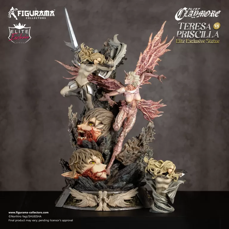 Teresa vs. Priscilla Elite Exclusive Statue commemorates one of the manga’s most memorable encounters with premium artistry. Teresa wields Clare’s diecast metal claymore, with swappable portraits portraying either her iconic “faint smile” or golden-eyed state, as she releases 10% of her Yoki energy against an Awakened Priscilla. Amidst the carnage of the battlefield lie two of Claymore Cassandra’s hydra heads, severed from Priscilla during the clash, and the three discarded blades of the former top-ranked Claymore, Roxanne, Cassandra, and Hysteria.