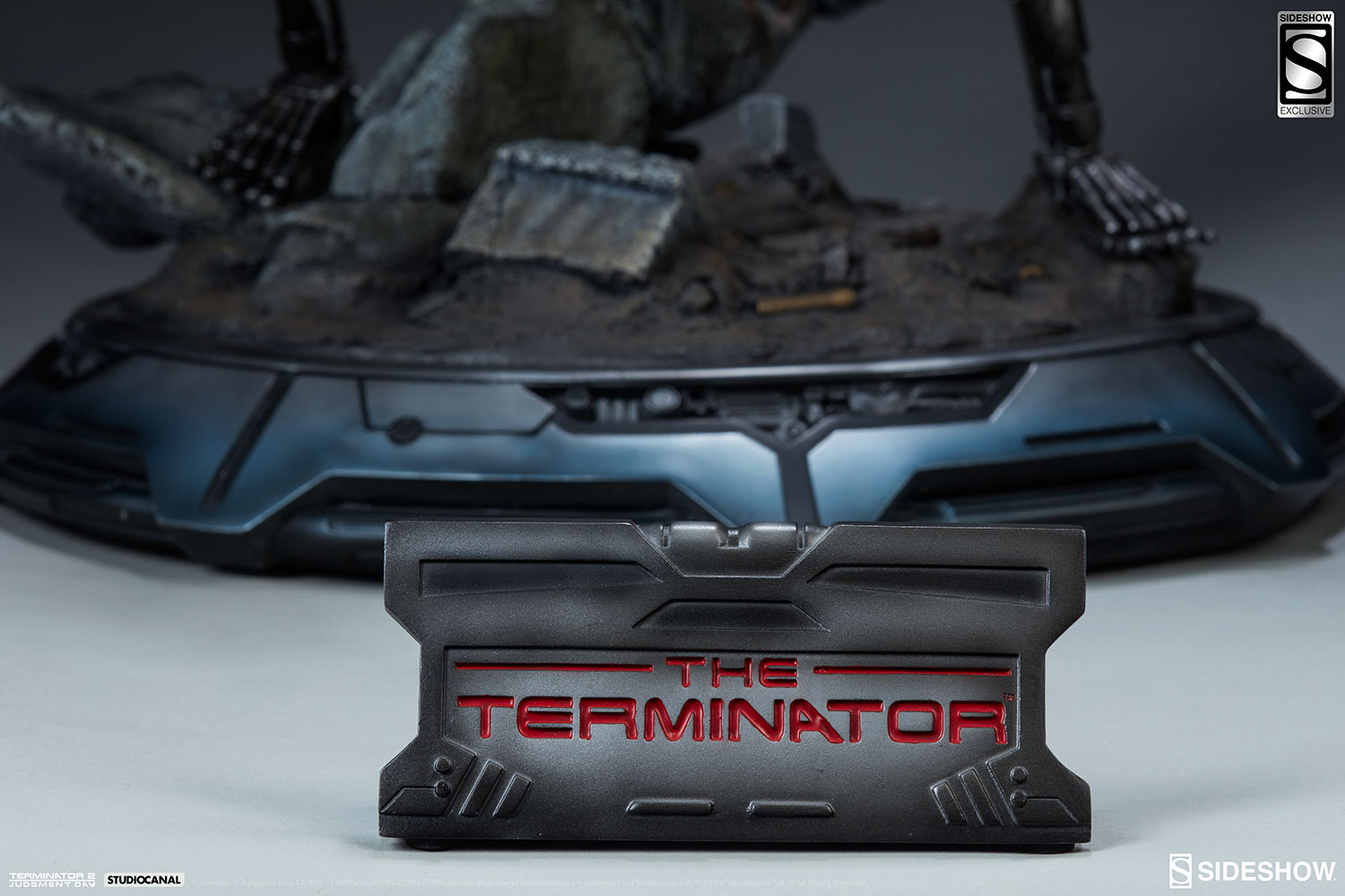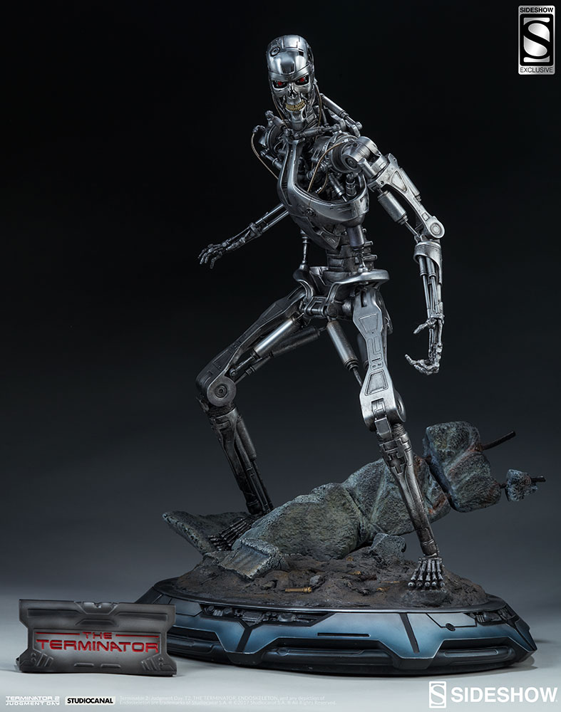 Poised with piercing glowing eyes on a detailed environmental base, the Terminator Endoskeleton Maquette is a critical centerpiece to any collector who values Skynet over her own safety.