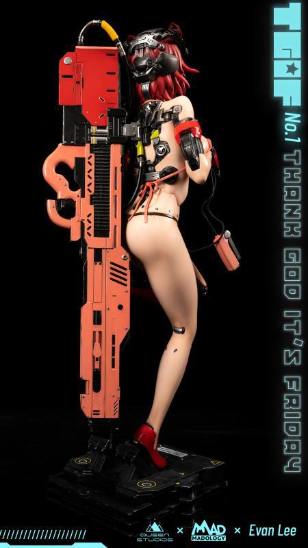 TGIF No.1 is a humanoid female warrior from Evan Lee’s dystopian universe. She disarms her enemies with her voluptuous female form and innocent expression. But this only serves as a distraction. This warrior has a cold and precise interior, which is visible in her mechanical limbs. If you have any doubts on her power, the enormous gun on her back serves as a chilling reminder.
